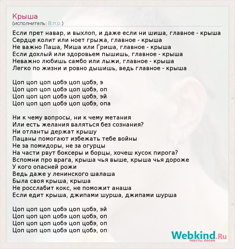 Если прет навар, и выхлоп, и даже если ни шиша, главное - крыша Сердце колит или ноет грыжа, главное - крыша Не важно Паша, Миша или Гриша, главное - крыша Если дохлый или здоровьем пышишь, главное - крыша Неважно любишь самбо или лыжи, главное - крыша Легко по жизни и ровно дышишь, ведь главное - крыша Цоп цоп цоп цобэ цоп цобэ, э Цоп цоп цоп цобэ цоп цобэ, оп Цоп цоп цоп цобэ цоп цобэ, эй Цоп цоп цоп цобэ цоп цобэ, опа Ни к чему вопросы, ни к чему метания Или есть желания валяться без сознания? Ни отланты держат крышу Пацаны помогают избежать тебе войны Не за помидоры, не за огурцы На части рвут боксеры и борцы, хочеш кусок пирога? Вспомни про врага, крыша чья выше, крыша чья дороже У кого опасней рожи Ведь даже у ленинского шалаша Была своя крыша, крыша Не росслабит кокс, не поможит анаша Если едит крыша, джипами шурша, джипами шурша Цоп цоп цоп цобэ цоп цобэ, эй Цоп цоп цоп цобэ цоп цобэ, оп Цоп цоп цоп цобэ цоп цобэ, оп Цоп цоп цоп цобэ цоп цобэ, оп