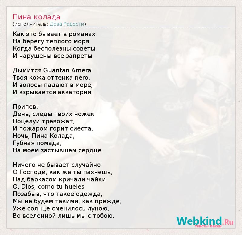 Как это бывает в романах На берегу теплого моря Когда бесполезны советы И нарушены все запреты Дымится Guantan Amera Твоя кожа оттенка nero, И волосы падают в море, И взрывается акватория Припев: День, следы твоих ножек Поцелуи тревожат, И пожаром горит сиеста, Ночь, Пина Колада, Губная помада, На моем застывшем сердце. Ничего не бывает случайно О Господи, как же ты пахнешь, Над баркасом кричали чайки O, Dios, como tu hueles Позабыв, что такое одежда, Мы не будем такими, как прежде, Уже солнце сменилось луною, Во вселенной лишь мы с тобою.