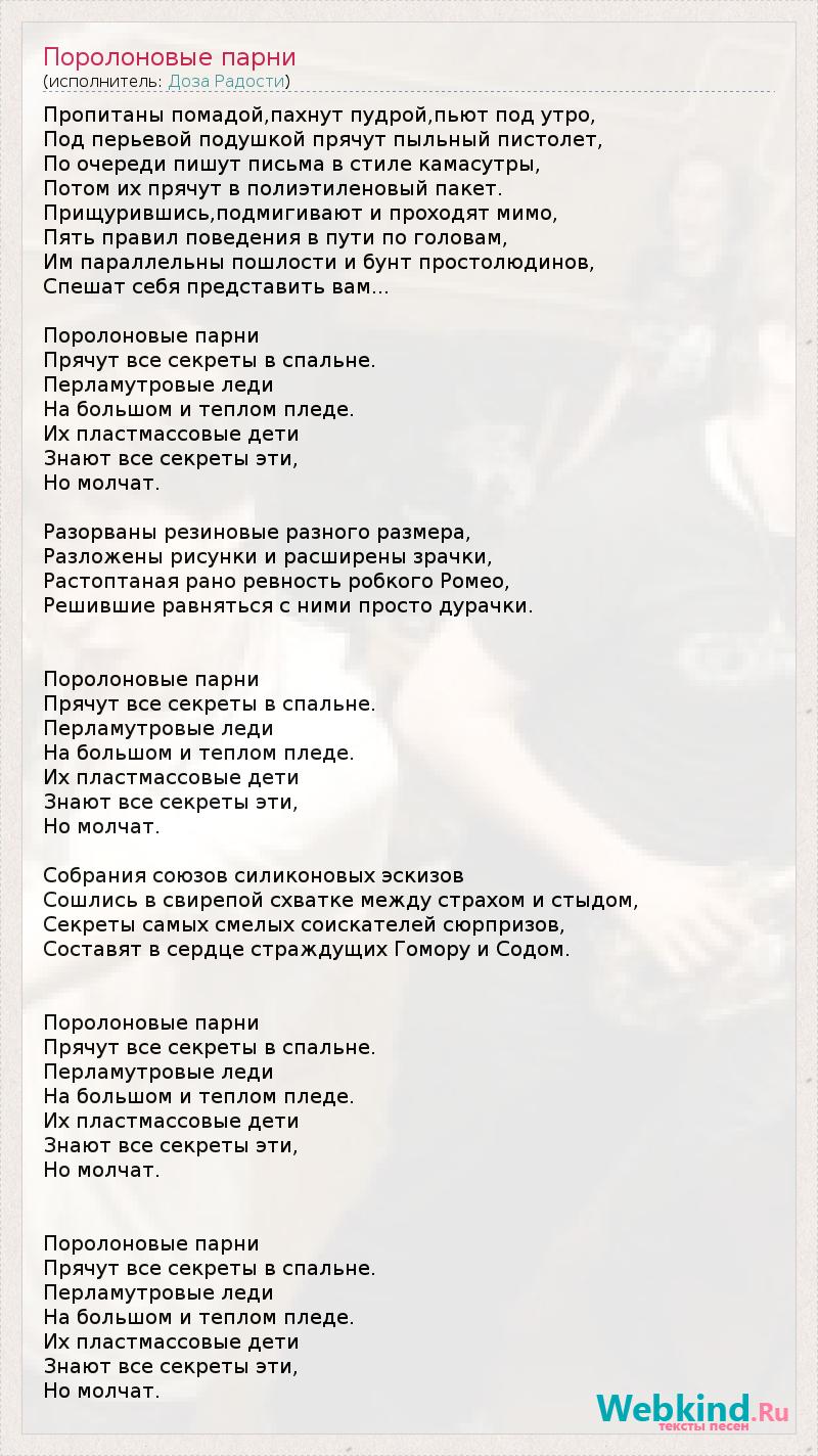 Пропитаны помадой,пахнут пудрой,пьют под утро, Под перьевой подушкой прячут пыльный пистолет, По очереди пишут письма в стиле камасутры, Потом их прячут в полиэтиленовый пакет. Прищурившись,подмигивают и проходят мимо, Пять правил поведения в пути по головам, Им параллельны пошлости и бунт простолюдинов, Спешат себя представить вам... Поролоновые парни Прячут все секреты в спальне. Перламутровые леди На большом и теплом пледе. Их пластмассовые дети Знают все секреты эти, Но молчат. Разорваны резиновые разного размера, Разложены рисунки и расширены зрачки, Растоптаная рано ревность робкого Ромео, Решившие равняться с ними просто дурачки. Поролоновые парни Прячут все секреты в спальне. Перламутровые леди На большом и теплом пледе. Их пластмассовые дети Знают все секреты эти, Но молчат. Собрания союзов силиконовых эскизов Сошлись в свирепой схватке между страхом и стыдом, Секреты самых смелых соискателей сюрпризов, Составят в сердце страждущих Гомору и Содом. Поролоновые парни Прячут все секреты в спальне. Перламутровые леди На большом и теплом пледе. Их пластмассовые дети Знают все секреты эти, Но молчат. Поролоновые парни Прячут все секреты в спальне. Перламутровые леди На большом и теплом пледе. Их пластмассовые дети Знают все секреты эти, Но молчат.