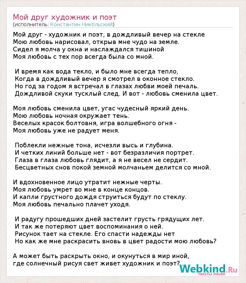 «Одни говорят, что эту песню Никольский сочинил в 23, другие - что в 25 (он сам сказал, что в 25). Это важно только для биографов, но мое предложение написать авторизованную биографию его, к сожалению, не заинтересовало. Всякий знаток поэзии, услышав эту песню, не мог не признать, что появился новый выдающийся русский поэт. Но влиятельные знатоки поэзии были тогда людьми немолодыми и рок не слушали. Впрочем, воз и ныне там. Когда я упомянул «Мой друг, художник и поэт» в статье, которую публиковал в «Литературной учебе», и написал, что стихотворение (с оговоркой «на мой взгляд»), именно стихотворение (без музыки) является шедевром русской поэзии, это вызвало единственное недовольство у редактора, и от смелого (хотя вполне справедливого) высказывания пришлось отказаться. Можно ли назвать какую-то песню самой любимой? У одной группы, певца, певицы - да, конечно. А если в целом? Но, когда я впервые услышал «Мой друг, художник и поэт», я около часа находился в каком-то трансе. Ни одна песня, ни одно стихотворение на меня так не действовали».— Вадим Николаев, "Заметки о русском роке"