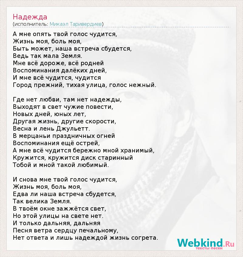 А мне опять твой голос чудится, Жизнь моя, боль моя, Быть может, наша встреча сбудется, Ведь так мала Земля. Мне всё дороже, всё родней Воспоминания далёких дней, И мне всё чудится, чудится Город прежний, тихая улица, голос нежный. Где нет любви, там нет надежды, Выходят в свет чужие повести, Новых дней, юных лет, Другая жизнь, другие скорости, Весна и лень Джульетт. В мерцаньи праздничных огней Воспоминания ещё острей, А мне всё чудится бережно мной хранимый, Кружится, кружится диск старинный Тобой и мной такой любимый. И снова мне твой голос чудится, Жизнь моя, боль моя, Едва ли наша встреча сбудется, Так велика Земля. В твоём окне зажжётся свет, Но этой улицы на свете нет. И только дальняя, дальняя Песня ветра сердцу печальному, Нет ответа и лишь надеждой жизнь согрета.