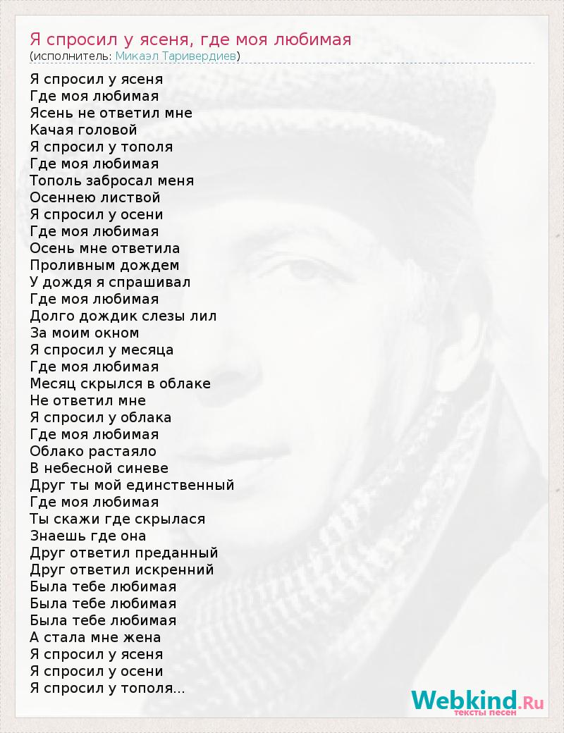 Я спросил у ясеня Где моя любимая Ясень не ответил мне Качая головой Я спросил у тополя Где моя любимая Тополь забросал меня Осеннею листвой Я спросил у осени Где моя любимая Осень мне ответила Проливным дождем У дождя я спрашивал Где моя любимая Долго дождик слезы лил За моим окном Я спросил у месяца Где моя любимая Месяц скрылся в облаке Не ответил мне Я спросил у облака Где моя любимая Облако растаяло В небесной синеве Друг ты мой единственный Где моя любимая Ты скажи где скрылася Знаешь где она Друг ответил преданный Друг ответил искренний Была тебе любимая Была тебе любимая Была тебе любимая А стала мне жена Я спросил у ясеня Я спросил у осени Я спросил у тополя...