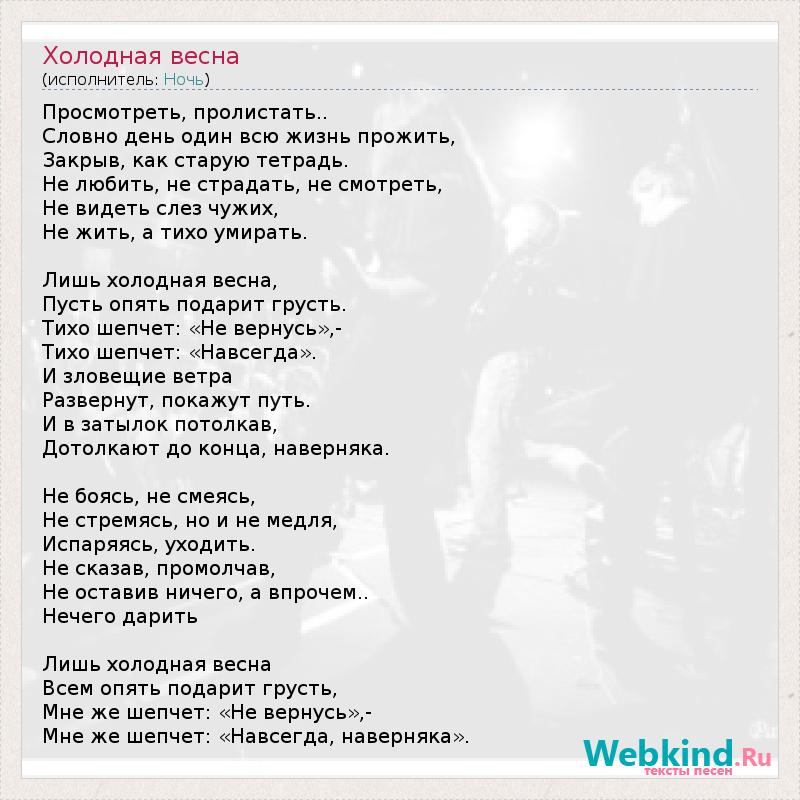 Просмотреть, пролистать.. Словно день один всю жизнь прожить, Закрыв, как старую тетрадь. Не любить, не страдать, не смотреть, Не видеть слез чужих, Не жить, а тихо умирать. Лишь холодная весна, Пусть опять подарит грусть. Тихо шепчет: «Не вернусь»,- Тихо шепчет: «Навсегда». И зловещие ветра Развернут, покажут путь. И в затылок потолкав, Дотолкают до конца, наверняка. Не боясь, не смеясь, Не стремясь, но и не медля, Испаряясь, уходить. Не сказав, промолчав, Не оставив ничего, а впрочем.. Нечего дарить Лишь холодная весна Всем опять подарит грусть, Мне же шепчет: «Не вернусь»,- Мне же шепчет: «Навсегда, наверняка».