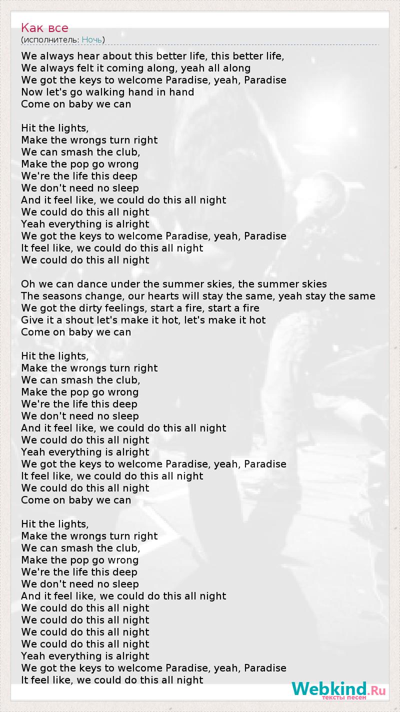 We always hear about this better life, this better life, We always felt it coming along, yeah all along We got the keys to welcome Paradise, yeah, Paradise Now let's go walking hand in hand Come on baby we can Hit the lights, Make the wrongs turn right We can smash the club, Make the pop go wrong We're the life this deep We don't need no sleep And it feel like, we could do this all night We could do this all night Yeah everything is alright We got the keys to welcome Paradise, yeah, Paradise It feel like, we could do this all night We could do this all night Oh we can dance under the summer skies, the summer skies The seasons change, our hearts will stay the same, yeah stay the same We got the dirty feelings, start a fire, start a fire Give it a shout let's make it hot, let's make it hot Come on baby we can Hit the lights, Make the wrongs turn right We can smash the club, Make the pop go wrong We're the life this deep We don't need no sleep And it feel like, we could do this all night We could do this all night Yeah everything is alright We got the keys to welcome Paradise, yeah, Paradise It feel like, we could do this all night We could do this all night Come on baby we can Hit the lights, Make the wrongs turn right We can smash the club, Make the pop go wrong We're the life this deep We don't need no sleep And it feel like, we could do this all night We could do this all night We could do this all night We could do this all night We could do this all night Yeah everything is alright We got the keys to welcome Paradise, yeah, Paradise It feel like, we could do this all night