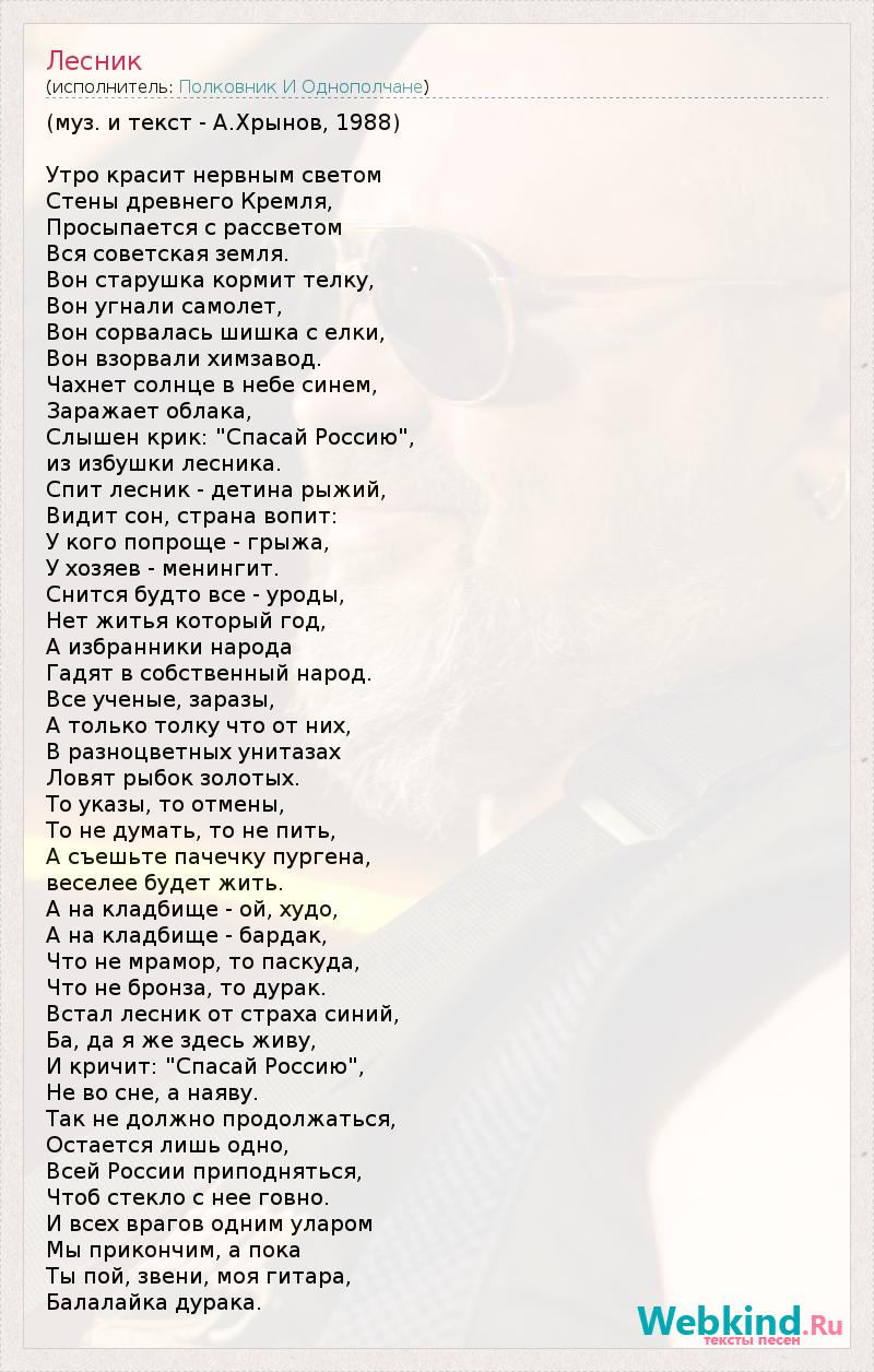 (муз. и текст - А.Хрынов, 1988) Утро красит нервным светом Стены древнего Кремля, Просыпается с рассветом Вся советская земля. Вон старушка кормит телку, Вон угнали самолет, Вон сорвалась шишка с елки, Вон взорвали химзавод. Чахнет солнце в небе синем, Заражает облака, Слышен крик: "Спасай Россию", из избушки лесника. Спит лесник - детина рыжий, Видит сон, страна вопит: У кого попроще - грыжа, У хозяев - менингит. Снится будто все - уроды, Нет житья который год, А избранники народа Гадят в собственный народ. Все ученые, заразы, А только толку что от них, В разноцветных унитазах Ловят рыбок золотых. То указы, то отмены, То не думать, то не пить, А съешьте пачечку пургена, веселее будет жить. А на кладбище - ой, худо, А на кладбище - бардак, Что не мрамор, то паскуда, Что не бронза, то дурак. Встал лесник от страха синий, Ба, да я же здесь живу, И кричит: "Спасай Россию", Не во сне, а наяву. Так не должно продолжаться, Остается лишь одно, Всей России приподняться, Чтоб стекло с нее говно. И всех врагов одним уларом Мы прикончим, а пока Ты пой, звени, моя гитара, Балалайка дурака.