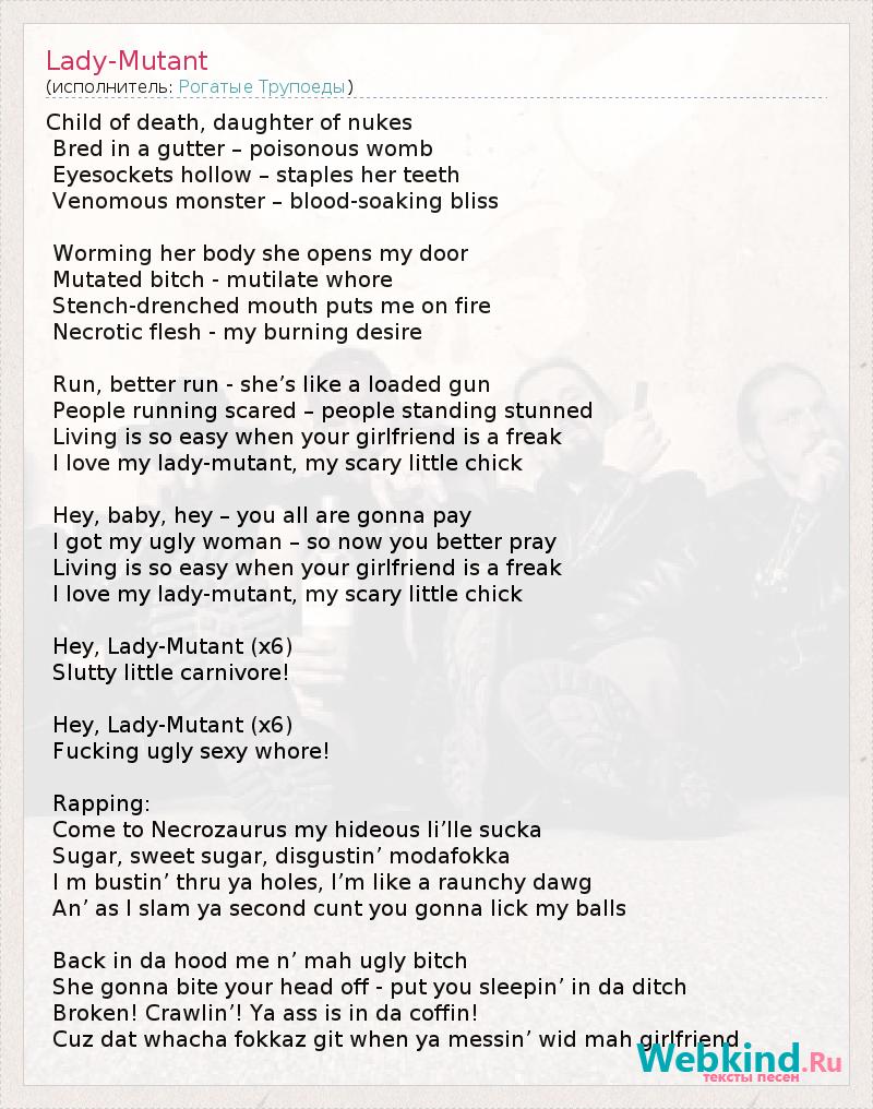 Child of death, daughter of nukes Bred in a gutter – poisonous womb Eyesockets hollow – staples her teeth Venomous monster – blood-soaking bliss Worming her body she opens my door Mutated bitch - mutilate whore Stench-drenched mouth puts me on fire Necrotic flesh - my burning desire Run, better run - she’s like a loaded gun People running scared – people standing stunned Living is so easy when your girlfriend is a freak I love my lady-mutant, my scary little chick Hey, baby, hey – you all are gonna pay I got my ugly woman – so now you better pray Living is so easy when your girlfriend is a freak I love my lady-mutant, my scary little chick Hey, Lady-Mutant (x6) Slutty little carnivore! Hey, Lady-Mutant (x6) Fucking ugly sexy whore! Rapping: Come to Necrozaurus my hideous li’lle sucka Sugar, sweet sugar, disgustin’ modafokka I m bustin’ thru ya holes, I’m like a raunchy dawg An’ as I slam ya second cunt you gonna lick my balls Back in da hood me n’ mah ugly bitch She gonna bite your head off - put you sleepin’ in da ditch Broken! Crawlin’! Ya ass is in da coffin! Cuz dat whacha fokkaz git when ya messin’ wid mah girlfriend