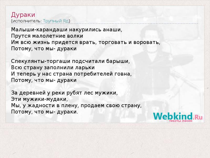 Малыши-карандаши накурились анаши, Прутся малолетние волки Им всю жизнь придется врать, торговать и воровать, Потому, что мы- дураки Спекулянты-торгаши подсчитали барыши, Всю страну заполнили ларьки И теперь у нас страна потребителей говна, Потому, что мы- дураки За деревней у реки рубят лес мужики, Эти мужики-мудаки, Мы, у жадности в плену, продаем свою страну, Потому, что мы- дураки.