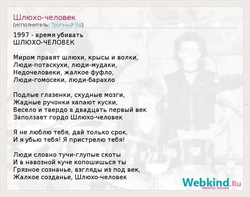 1997 - время убивать ШЛЮХО-ЧЕЛОВЕК Миром правят шлюхи, крысы и волки, Люди-потаскухи, люди-мудаки, Недочеловеки, жалкое фуфло, Люди-гомосеки, люди-барахло Подлые глазенки, скудные мозги, Жадные ручонки хапают куски, Весело и твердо в двадцать первый век Заползает гордо Шлюхо-человек Я не люблю тебя, дай только срок, И я убью тебя! Я пристрелю тебя! Люди словно тучи-глупые скоты И в навозной куче копошишься ты Грязное сознанье, взгляды из под век, Жалкое созданье, Шлюхо-человек