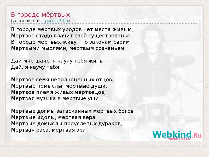 В городе мертвых уродов нет места живым, Мертвое стадо влачит своё существованье, В городе мертвых живут по законам своим Мертвыми мыслями, мертвым сознаньем Дай мне шанс, я научу тебя жить Дай, я научу тебя Мертвое семя неполноценных отцов, Мертвые помыслы, мертвые души, Мертвое племя живых мертвецов, Мертвая музыка в мертвые уши Мертвые догмы затасканных мертвых богов Мертвые идолы, мертвая вера, Мертвые домыслы полуслепых дураков, Мертвая раса, мертвая эра