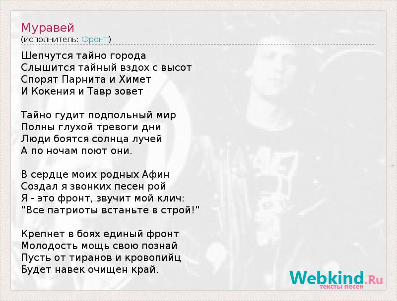 Шепчутся тайно города Слышится тайный вздох с высот Спорят Парнита и Химет И Кокения и Тавр зовет Тайно гудит подпольный мир Полны глухой тревоги дни Люди боятся солнца лучей А по ночам поют они. В сердце моих родных Афин Создал я звонких песен рой Я - это фронт, звучит мой клич: "Все патриоты встаньте в строй!" Крепнет в боях единый фронт Молодость мощь свою познай Пусть от тиранов и кровопийц Будет навек очищен край.