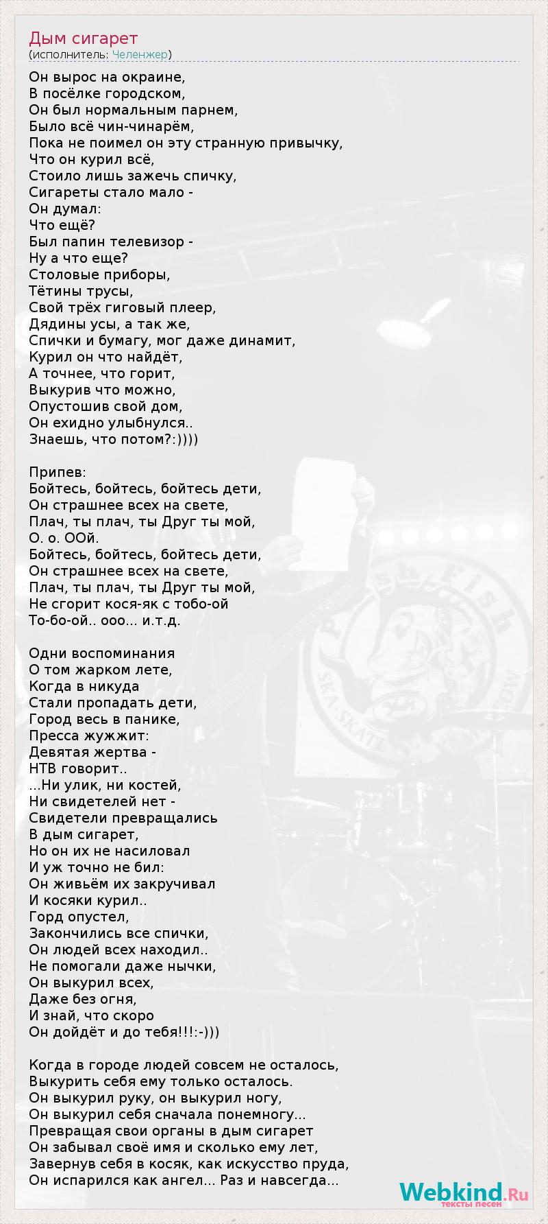 He grew up in the suburbs, In the settlement of the city , He was a normal guy , It was all the rank - chinarёm , Until he raped this strange habit , That he had smoked all Had only to light a match , Cigarettes became a little - He thought : What else? Was my father's TV - Well, what else? Cutlery, Aunt's pants His three gigs player Uncle's mustache, as well as , Matches and paper , could not even dynamite He smoked that will, Or rather , that burns , That can be smoked , Emptying his house , He smiled slyly .. You know, what then? :)))) Chorus: Afraid, afraid, afraid of the children , He is worse than anyone in the world , Crying, you cry , you 're my friend , Od . Ooi . Afraid, afraid, afraid of the children , He is worse than anyone in the world , Crying, you cry , you 're my friend , Do not burn mowing - yak with Tobo th Then -bo - oh .. ohh ... etc. only memories On that hot summer , When nowhere Children began to disappear , The city all in a panic , Press buzzing : Nine of the victims - NTV said .. ... No evidence , no bones, Neither there are no witnesses - witnesses turned In cigarette smoke, But he did not rape And I certainly did not beat : He twisted them alive And shoals of smoking .. Gord was empty, Ended all matches He found all the people .. Did not help even nychki , He smoked all Even without the fire, And know that soon He reaches up and you !!! :- ))) When the men of the city is not left , Smoke myself to him just left. He smoked his hand , he smoked leg He smoked a little at first ... Turning their bodies in cigarette smoke He forgot his name and how old he is , Wrapped himself in a joint, as the art of the pond , He vanished like an angel ... Once and for all ...