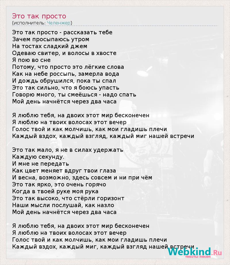 Это так просто - рассказать тебе Зачем просыпаюсь утром На тостах сладкий джем Одеваю свитер, и волосы в хвосте Я пою во сне Потому, что просто это лёгкие слова Как на небе россыпь, замерла вода И дождь обрушился, пока ты спал Это так сильно, что я боюсь упасть Говорю много, ты смеёшься - надо спать Мой день начнётся через два часа Я люблю тебя, на двоих этот мир бесконечен Я люблю на твоих волосах этот вечер Голос твой и как молчишь, как мои гладишь плечи Каждый вздох, каждый взгляд, каждый миг нашей встречи Это так мало, я не в силах удержать Каждую секунду. И мне не передать Как цвет меняет вдруг твои глаза И весна, возможно, здесь совсем и ни при чём Это так ярко, это очень горячо Когда в твоей руке моя рука Это так высоко, что стёрли горизонт Наши мысли послушай, как назло Мой день начнётся через два часа Я люблю тебя, на двоих этот мир бесконечен Я люблю на твоих волосах этот вечер Голос твой и как молчишь, как мои гладишь плечи Каждый вздох, каждый миг, каждый взгляд нашей встречи