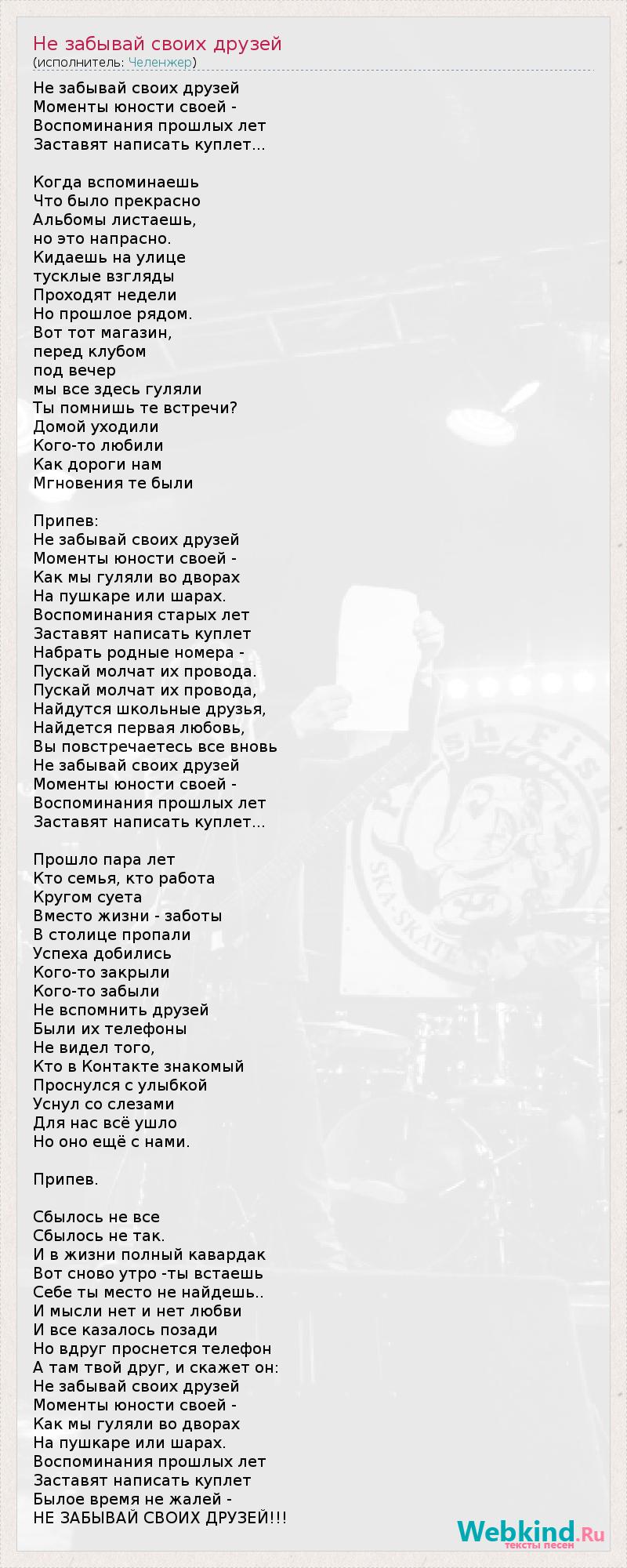 Не забывай своих друзей Моменты юности своей - Воспоминания прошлых лет Заставят написать куплет... Когда вспоминаешь Что было прекрасно Альбомы листаешь, но это напрасно. Кидаешь на улице тусклые взгляды Проходят недели Но прошлое рядом. Вот тот магазин, перед клубом под вечер мы все здесь гуляли Ты помнишь те встречи? Домой уходили Кого-то любили Как дороги нам Мгновения те были Припев: Не забывай своих друзей Моменты юности своей - Как мы гуляли во дворах На пушкаре или шарах. Воспоминания старых лет Заставят написать куплет Набрать родные номера - Пускай молчат их провода. Пускай молчат их провода, Найдутся школьные друзья, Найдется первая любовь, Вы повстречаетесь все вновь Не забывай своих друзей Моменты юности своей - Воспоминания прошлых лет Заставят написать куплет... Прошло пара лет Кто семья, кто работа Кругом суета Вместо жизни - заботы В столице пропали Успеха добились Кого-то закрыли Кого-то забыли Не вспомнить друзей Были их телефоны Не видел того, Кто в Контакте знакомый Проснулся с улыбкой Уснул со слезами Для нас всё ушло Но оно ещё с нами. Припев. Сбылось не все Сбылось не так. И в жизни полный кавардак Вот сново утро -ты встаешь Себе ты место не найдешь.. И мысли нет и нет любви И все казалось позади Но вдруг проснется телефон А там твой друг, и скажет он: Не забывай своих друзей Моменты юности своей - Как мы гуляли во дворах На пушкаре или шарах. Воспоминания прошлых лет Заставят написать куплет Былое время не жалей - НЕ ЗАБЫВАЙ СВОИХ ДРУЗЕЙ!!!