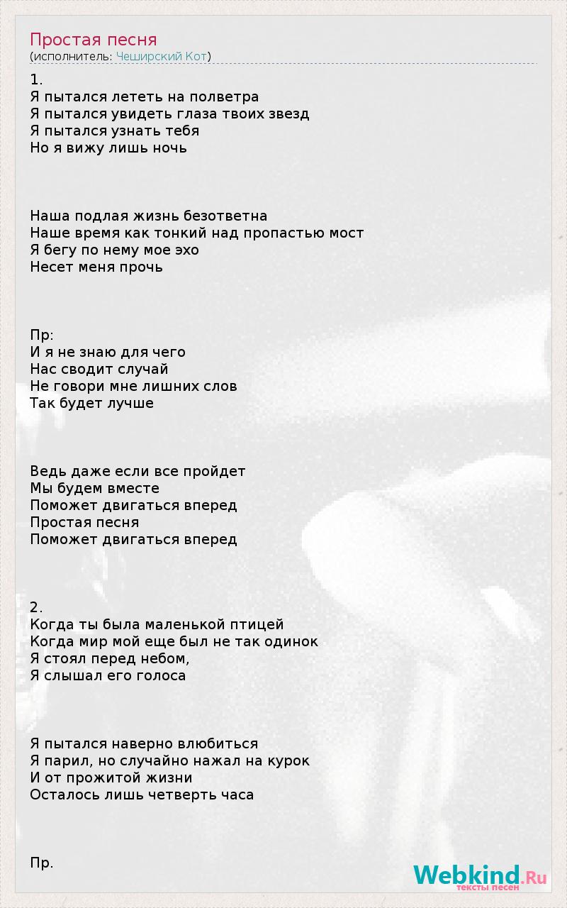 1. Я пытался лететь на полветра Я пытался увидеть глаза твоих звезд Я пытался узнать тебя Но я вижу лишь ночь Наша подлая жизнь безответна Наше время как тонкий над пропастью мост Я бегу по нему мое эхо Несет меня прочь Пр: И я не знаю для чего Нас сводит случай Не говори мне лишних слов Так будет лучше Ведь даже если все пройдет Мы будем вместе Поможет двигаться вперед Простая песня Поможет двигаться вперед 2. Когда ты была маленькой птицей Когда мир мой еще был не так одинок Я стоял перед небом, Я слышал его голоса Я пытался наверно влюбиться Я парил, но случайно нажал на курок И от прожитой жизни Осталось лишь четверть часа Пр.