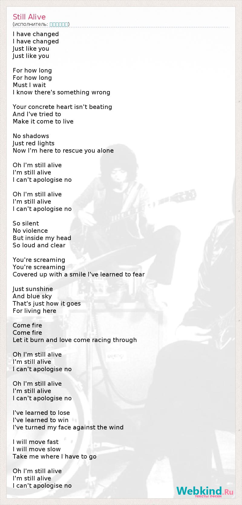 I have changed I have changed Just like you Just like you For how long For how long Must I wait I know there's something wrong Your concrete heart isn't beating And I've tried to Make it come to live No shadows Just red lights Now I'm here to rescue you alone Oh I'm still alive I'm still alive I can't apologise no Oh I'm still alive I'm still alive I can't apologise no So silent No violence But inside my head So loud and clear You're screaming You're screaming Covered up with a smile I've learned to fear Just sunshine And blue sky That's just how it goes For living here Come fire Come fire Let it burn and love come racing through Oh I'm still alive I'm still alive I can't apologise no Oh I'm still alive I'm still alive I can't apologise no I've learned to lose I've learned to win I've turned my face against the wind I will move fast I will move slow Take me where I have to go Oh I'm still alive I'm still alive I can't apologise no
