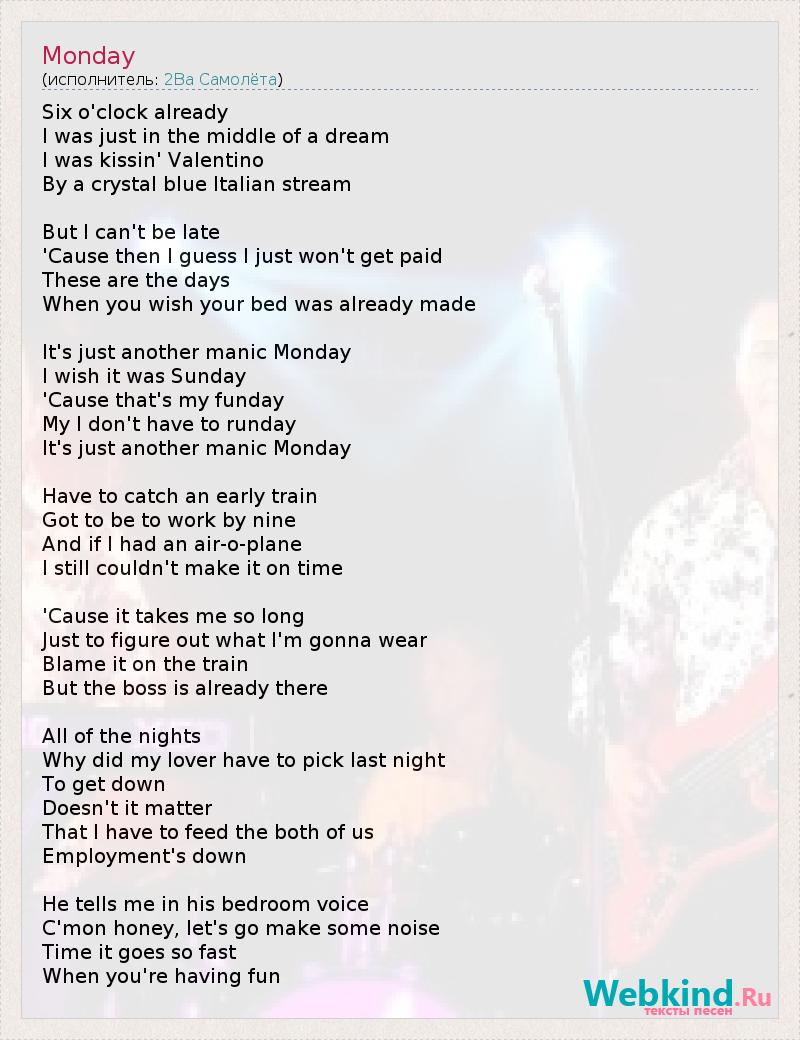 Уже шесть часов, И я была прямо в середине своего сна, Я целовалась с Валентино* У кристально голубой итальянской реки. Но я не могу опаздывать, Потому что тогда, полагаю, мне просто не заплатят. Ох уж эти дни, Когда тебя хочется, чтобы твоя постель уже была убрана. Это просто еще один чумовой понедельник, Как бы я хотела, чтобы он был воскресеньем, Потому что тогда я бы развлекалась, И мне не надо было бы никуда бежать. Это просто еще один чумовой понедельник. Мне нужно успеть на ранний поезд, Надо быть на работе к девяти. Даже если бы у меня был самолет, Я бы все равно не успела бы приехать вовремя. Потому что мне требуется так много времени Даже для того, чтобы решить, что мне надеть, Во всем виноват этот поезд, Но босс уже на месте. Все эти ночи... Почему мой возлюбленный выбирает последнюю ночь, Чтобы уделить мне внимание? Не все ли равно когда, Ведь это мне приходится кормить нас обоих. Работа угнетает. Он говорит мне своим постельным голосом: Милая, давай немножко пошумим. Время течет так быстро, Когда же тебе еще повеселиться? * Рудольфо Валентино (1895 - 1926) - американский киноактёр итальянского происхождения, секс-символ эпохи немого кино.