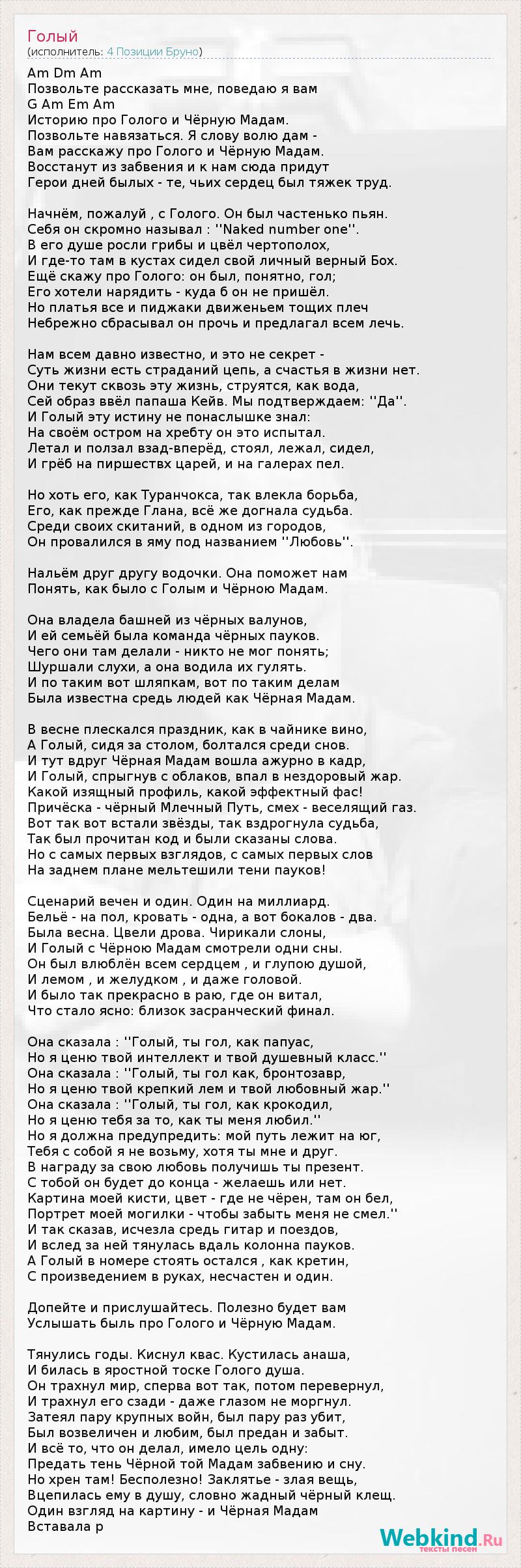 Am Dm Am Позвольте рассказать мне, поведаю я вам G Am Em Am Историю про Голого и Чёрную Мадам. Позвольте навязаться. Я слову волю дам - Вам расскажу про Голого и Чёрную Мадам. Восстанут из забвения и к нам сюда придут Герои дней былых - те, чьих сердец был тяжек труд. Начнём, пожалуй , с Голого. Он был частенько пьян. Себя он скромно называл : ''Naked number one''. В его душе росли грибы и цвёл чертополох, И где-то там в кустах сидел свой личный верный Бох. Ещё скажу про Голого: он был, понятно, гол; Его хотели нарядить - куда б он не пришёл. Но платья все и пиджаки движеньем тощих плеч Небрежно сбрасывал он прочь и предлагал всем лечь. Нам всем давно известно, и это не секрет - Суть жизни есть страданий цепь, а счастья в жизни нет. Они текут сквозь эту жизнь, струятся, как вода, Сей образ ввёл папаша Кейв. Мы подтверждаем: ''Да''. И Голый эту истину не понаслышке знал: На своём остром на хребту он это испытал. Летал и ползал взад-вперёд, стоял, лежал, сидел, И грёб на пиршествх царей, и на галерах пел. Но хоть его, как Туранчокса, так влекла борьба, Его, как прежде Глана, всё же догнала судьба. Среди своих скитаний, в одном из городов, Он провалился в яму под названием ''Любовь''. Нальём друг другу водочки. Она поможет нам Понять, как было с Голым и Чёрною Мадам. Она владела башней из чёрных валунов, И ей семьёй была команда чёрных пауков. Чего они там делали - никто не мог понять; Шуршали слухи, а она водила их гулять. И по таким вот шляпкам, вот по таким делам Была известна средь людей как Чёрная Мадам. В весне плескался праздник, как в чайнике вино, А Голый, сидя за столом, болтался среди снов. И тут вдруг Чёрная Мадам вошла ажурно в кадр, И Голый, спрыгнув с облаков, впал в нездоровый жар. Какой изящный профиль, какой эффектный фас! Причёска - чёрный Млечный Путь, смех - веселящий газ. Вот так вот встали звёзды, так вздрогнула судьба, Так был прочитан код и были сказаны слова. Но с самых первых взглядов, с самых первых слов На заднем плане мельтешили тени пауков! Сценарий вечен и один. Один на миллиард. Бельё - на пол, кровать - одна, а вот бокалов - два. Была весна. Цвели дрова. Чирикали слоны, И Голый с Чёрною Мадам смотрели одни сны. Он был влюблён всем сердцем , и глупою душой, И лемом , и желудком , и даже головой. И было так прекрасно в раю, где он витал, Что стало ясно: близок засранческий финал. Она сказала : ''Голый, ты гол, как папуас, Но я ценю твой интеллект и твой душевный класс.'' Она сказала : ''Голый, ты гол как, бронтозавр, Но я ценю твой крепкий лем и твой любовный жар.'' Она сказала : ''Голый, ты гол, как крокодил, Но я ценю тебя за то, как ты меня любил.'' Но я должна предупредить: мой путь лежит на юг, Тебя с собой я не возьму, хотя ты мне и друг. В награду за свою любовь получишь ты презент. С тобой он будет до конца - желаешь или нет. Картина моей кисти, цвет - где не чёрен, там он бел, Портрет моей могилки - чтобы забыть меня не смел.'' И так сказав, исчезла средь гитар и поездов, И вслед за ней тянулась вдаль колонна пауков. А Голый в номере стоять остался , как кретин, С произведением в руках, несчастен и один. Допейте и прислушайтесь. Полезно будет вам Услышать быль про Голого и Чёрную Мадам. Тянулись годы. Киснул квас. Кустилась анаша, И билась в яростной тоске Голого душа. Он трахнул мир, сперва вот так, потом перевернул, И трахнул его сзади - даже глазом не моргнул. Затеял пару крупных войн, был пару раз убит, Был 