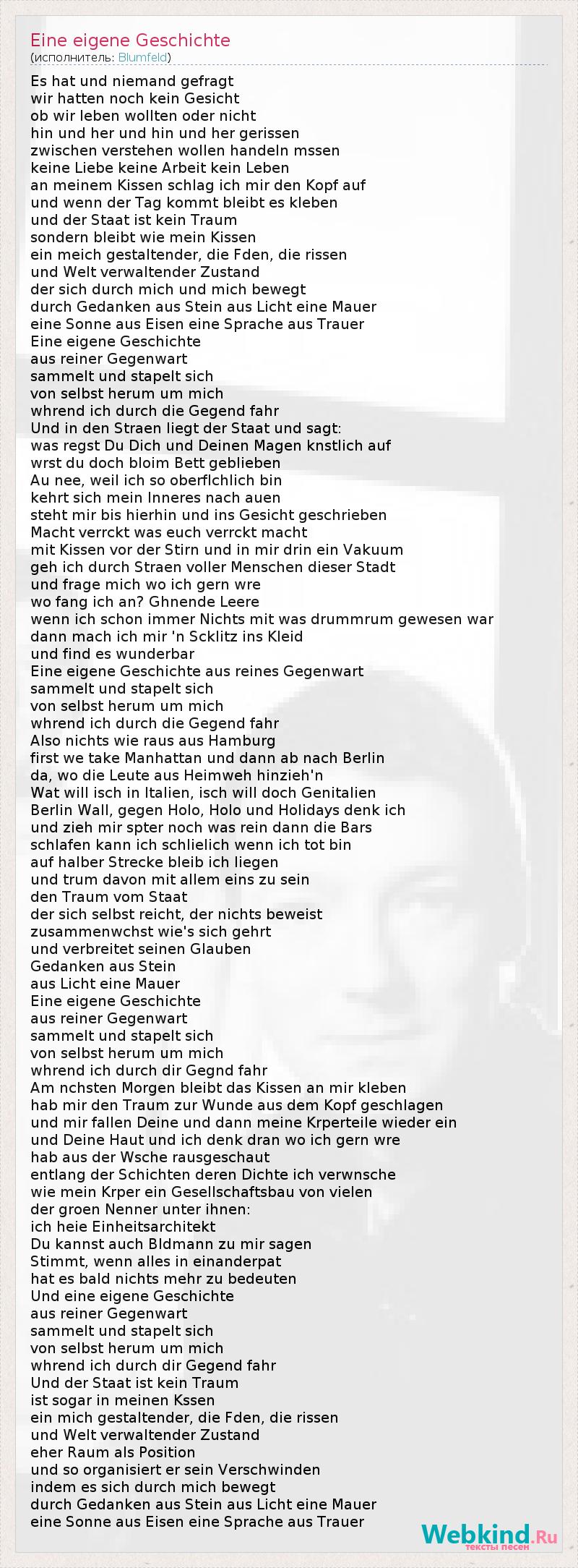 Es hat und niemand gefragt wir hatten noch kein Gesicht ob wir leben wollten oder nicht hin und her und hin und her gerissen zwischen verstehen wollen handeln mssen keine Liebe keine Arbeit kein Leben an meinem Kissen schlag ich mir den Kopf auf und wenn der Tag kommt bleibt es kleben und der Staat ist kein Traum sondern bleibt wie mein Kissen ein meich gestaltender, die Fden, die rissen und Welt verwaltender Zustand der sich durch mich und mich bewegt durch Gedanken aus Stein aus Licht eine Mauer eine Sonne aus Eisen eine Sprache aus Trauer Eine eigene Geschichte aus reiner Gegenwart sammelt und stapelt sich von selbst herum um mich whrend ich durch die Gegend fahr Und in den Straen liegt der Staat und sagt: was regst Du Dich und Deinen Magen knstlich auf wrst du doch bloim Bett geblieben Au nee, weil ich so oberflchlich bin kehrt sich mein Inneres nach auen steht mir bis hierhin und ins Gesicht geschrieben Macht verrckt was euch verrckt macht mit Kissen vor der Stirn und in mir drin ein Vakuum geh ich durch Straen voller Menschen dieser Stadt und frage mich wo ich gern wre wo fang ich an? Ghnende Leere wenn ich schon immer Nichts mit was drummrum gewesen war dann mach ich mir 'n Scklitz ins Kleid und find es wunderbar Eine eigene Geschichte aus reines Gegenwart sammelt und stapelt sich von selbst herum um mich whrend ich durch die Gegend fahr Also nichts wie raus aus Hamburg first we take Manhattan und dann ab nach Berlin da, wo die Leute aus Heimweh hinzieh'n Wat will isch in Italien, isch will doch Genitalien Berlin Wall, gegen Holo, Holo und Holidays denk ich und zieh mir spter noch was rein dann die Bars schlafen kann ich schlielich wenn ich tot bin auf halber Strecke bleib ich liegen und trum davon mit allem eins zu sein den Traum vom Staat der sich selbst reicht, der nichts beweist zusammenwchst wie's sich gehrt und verbreitet seinen Glauben Gedanken aus Stein aus Licht eine Mauer Eine eigene Geschichte aus reiner Gegenwart sammelt und stapelt sich von selbst herum um mich whrend ich durch dir Gegnd fahr Am nchsten Morgen bleibt das Kissen an mir kleben hab mir den Traum zur Wunde aus dem Kopf geschlagen und mir fallen Deine und dann meine Krperteile wieder ein und Deine Haut und ich denk dran wo ich gern wre hab aus der Wsche rausgeschaut entlang der Schichten deren Dichte ich verwnsche wie mein Krper ein Gesellschaftsbau von vielen der groen Nenner unter ihnen: ich heie Einheitsarchitekt Du kannst auch Bldmann zu mir sagen Stimmt, wenn alles in einanderpat hat es bald nichts mehr zu bedeuten Und eine eigene Geschichte aus reiner Gegenwart sammelt und stapelt sich von selbst herum um mich whrend ich durch dir Gegend fahr Und der Staat ist kein Traum ist sogar in meinen Kssen ein mich gestaltender, die Fden, die rissen und Welt verwaltender Zustand eher Raum als Position und so organisiert er sein Verschwinden indem es sich durch mich bewegt durch Gedanken aus Stein aus Licht eine Mauer eine Sonne aus Eisen eine Sprache aus Trauer