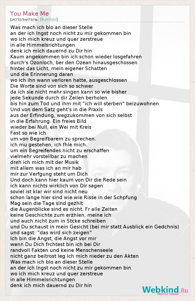 Это интересно:Blumfeld - немецкая инди-поп-группа из Гамбурга , Германия. Образованная певцом и автором песен Jochen Distelmeyer. Название группы было придумано по главному герою рассказа Франца Кафки "Blumfeld, ein älterer Junggeselle" . Blumfeld считаются одними из самых значительных представителей Hamburger Schule (школа Гамбурга) и считаются одними из самых успешных исполнителей из немецкой инди-сцены.Музыка Blumfeld's характеризуется... продолжение