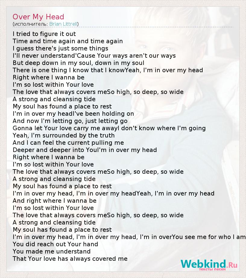 I tried to figure it out Time and time again and time again I guess there's just some things I'll never understand'Cause Your ways aren't our ways But deep down in my soul, down in my soul There is one thing I know that I knowYeah, I'm in over my head Right where I wanna be I'm so lost within Your love The love that always covers meSo high, so deep, so wide A strong and cleansing tide My soul has found a place to rest I'm in over my headI've been holding on And now I'm letting go, just letting go Gonna let Your love carry me awayI don't know where I'm going Yeah, I'm surrounded by the truth And I can feel the current pulling me Deeper and deeper into YouI'm in over my head Right where I wanna be I'm so lost within Your love The love that always covers meSo high, so deep, so wide A strong and cleansing tide My soul has found a place to rest I'm in over my head, I'm in over my headYeah, I'm in over my head And right where I wanna be I'm so lost within Your love The love that always covers meSo high, so deep, so wide A strong and cleansing tide My soul has found a place to rest I'm in over my head, I'm in over my head, I'm in overYou see me for who I am You did reach out Your hand You made me understand That Your love has always covered me