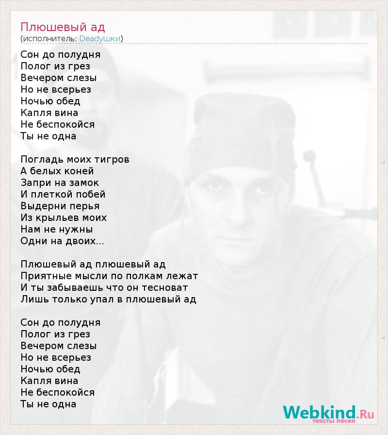 Сон до полудня Полог из грез Вечером слезы Но не всерьез Ночью обед Капля вина Не беспокойся Ты не одна Погладь моих тигров А белых коней Запри на замок И плеткой побей Выдерни перья Из крыльев моих Нам не нужны Одни на двоих... Плюшевый ад плюшевый ад Приятные мысли по полкам лежат И ты забываешь что он тесноват Лишь только упал в плюшевый ад Сон до полудня Полог из грез Вечером слезы Но не всерьез Ночью обед Капля вина Не беспокойся Ты не одна