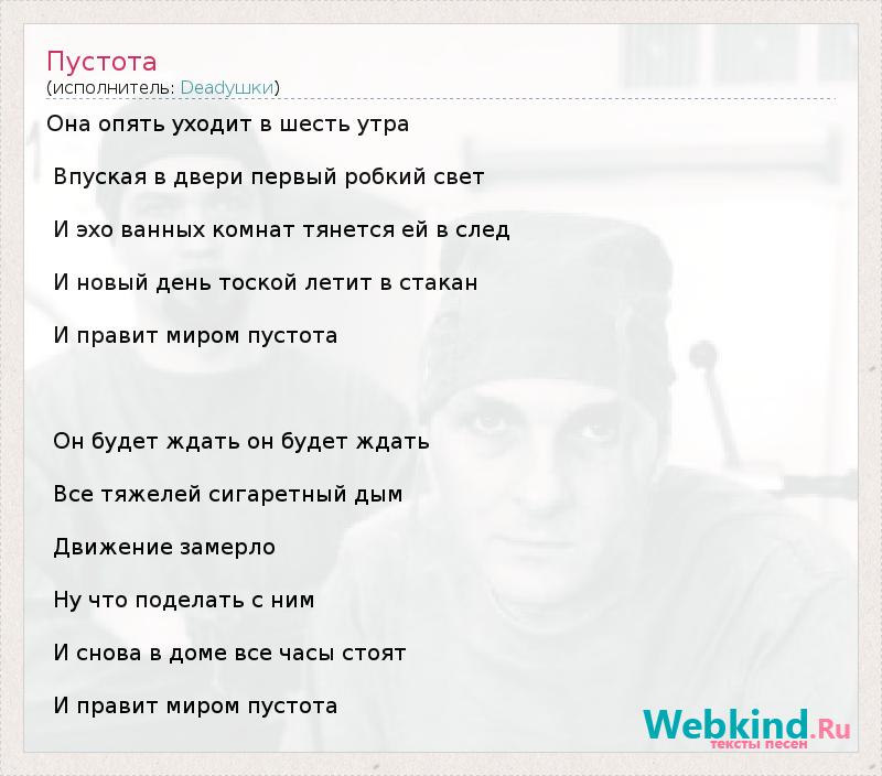 Она опять уходит в шесть утра Впуская в двери первый робкий свет И эхо ванных комнат тянется ей в след И новый день тоской летит в стакан И правит миром пустота Он будет ждать он будет ждать Все тяжелей сигаретный дым Движение замерло Ну что поделать с ним И снова в доме все часы стоят И правит миром пустота