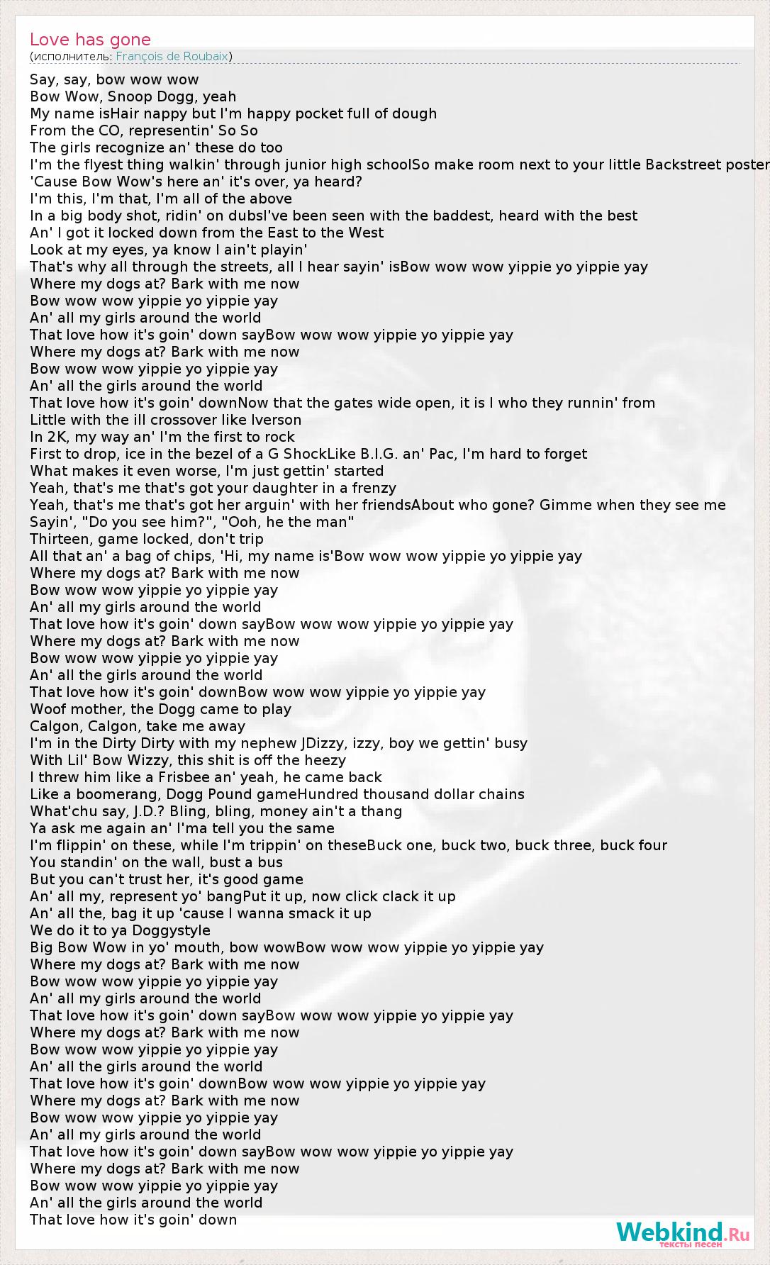 Say, say, bow wow wow Bow Wow, Snoop Dogg, yeah My name isHair nappy but I'm happy pocket full of dough From the CO, representin' So So The girls recognize an' these do too I'm the flyest thing walkin' through junior high schoolSo make room next to your little Backstreet poster 'Cause Bow Wow's here an' it's over, ya heard? I'm this, I'm that, I'm all of the above In a big body shot, ridin' on dubsI've been seen with the baddest, heard with the best An' I got it locked down from the East to the West Look at my eyes, ya know I ain't playin' That's why all through the streets, all I hear sayin' isBow wow wow yippie yo yippie yay Where my dogs at? Bark with me now Bow wow wow yippie yo yippie yay An' all my girls around the world That love how it's goin' down sayBow wow wow yippie yo yippie yay Where my dogs at? Bark with me now Bow wow wow yippie yo yippie yay An' all the girls around the world That love how it's goin' downNow that the gates wide open, it is I who they runnin' from Little with the ill crossover like Iverson In 2K, my way an' I'm the first to rock First to drop, ice in the bezel of a G ShockLike B.I.G. an' Pac, I'm hard to forget What makes it even worse, I'm just gettin' started Yeah, that's me that's got your daughter in a frenzy Yeah, that's me that's got her arguin' with her friendsAbout who gone? Gimme when they see me Sayin', "Do you see him?", "Ooh, he the man" Thirteen, game locked, don't trip All that an' a bag of chips, 'Hi, my name is'Bow wow wow yippie yo yippie yay Where my dogs at? Bark with me now Bow wow wow yippie yo yippie yay An' all my girls around the world That love how it's goin' down sayBow wow wow yippie yo yippie yay Where my dogs at? Bark with me now Bow wow wow yippie yo yippie yay An' all the girls around the world That love how it's goin' downBow wow wow yippie yo yippie yay Woof mother, the Dogg came to play Calgon, Calgon, take me away I'm in the Dirty Dirty with my nephew JDizzy, izzy, boy we gettin' busy With Lil' Bow Wizzy, this shit is off the heezy I threw him like a Frisbee an' yeah, he came back Like a boomerang, Dogg Pound gameHundred thousand dollar chains What'chu say, J.D.? Bling, bling, money ain't a thang Ya ask me again an' I'ma tell you the same I'm flippin' on these, while I'm trippin' on theseBuck one, buck two, buck three, buck four You standin' on the wall, bust a bus But you can't trust her, it's good game An' all my, represent yo' bangPut it up, now click clack it up An' all the, bag it up 'cause I wanna smack it up We do it to ya Doggystyle Big Bow Wow in yo' mouth, bow wowBow wow wow yippie yo yippie yay Where my dogs at? Bark with me now Bow wow wow yippie yo yippie yay An' all my girls around the world That love how it's goin' down sayBow wow wow yippie yo yippie yay Where my dogs at? Bark with me now Bow wow wow yippie yo yippie yay An' all the girls around the world That love how it's goin' downBow wow wow yippie yo yippie yay Where my dogs at? Bark with me now Bow wow wow yippie yo yippie yay An' all my girls around the world That love how it's goin' down sayBow wow wow yippie yo yippie yay Where my dogs at? Bark with me now Bow wow wow yippie yo yippie yay An' all the girls around the world That love how it's goin' down