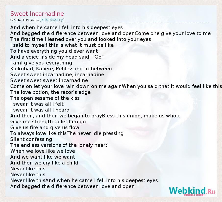 And when he came I fell into his deepest eyes And begged the difference between love and openCome one give your love to me The first time I leaned over you and looked into your eyes I said to myself this is what it must be like To have everything you'd ever want And a voice inside my head said, "Go" I amI give you everything Kaikobad, Kaliere, Pehlev and in-between Sweet sweet incarnadine, incarnadine Sweet sweet sweet incarnadine Come on let your love rain down on me againWhen you said that it would feel like this The love potion, the razor's edge The open sesame of the kiss I swear it was all I felt I swear it was all I heard And then, and then we began to prayBless this union, make us whole Give me strength to let him go Give us fire and give us flow To always love like thisThe never idle pressing Silent confessing The endless versions of the lonely heart When we love like we love And we want like we want And then we cry like a child Never like this Never like this Never like thisAnd when he came I fell into his deepest eyes And begged the difference between love and open