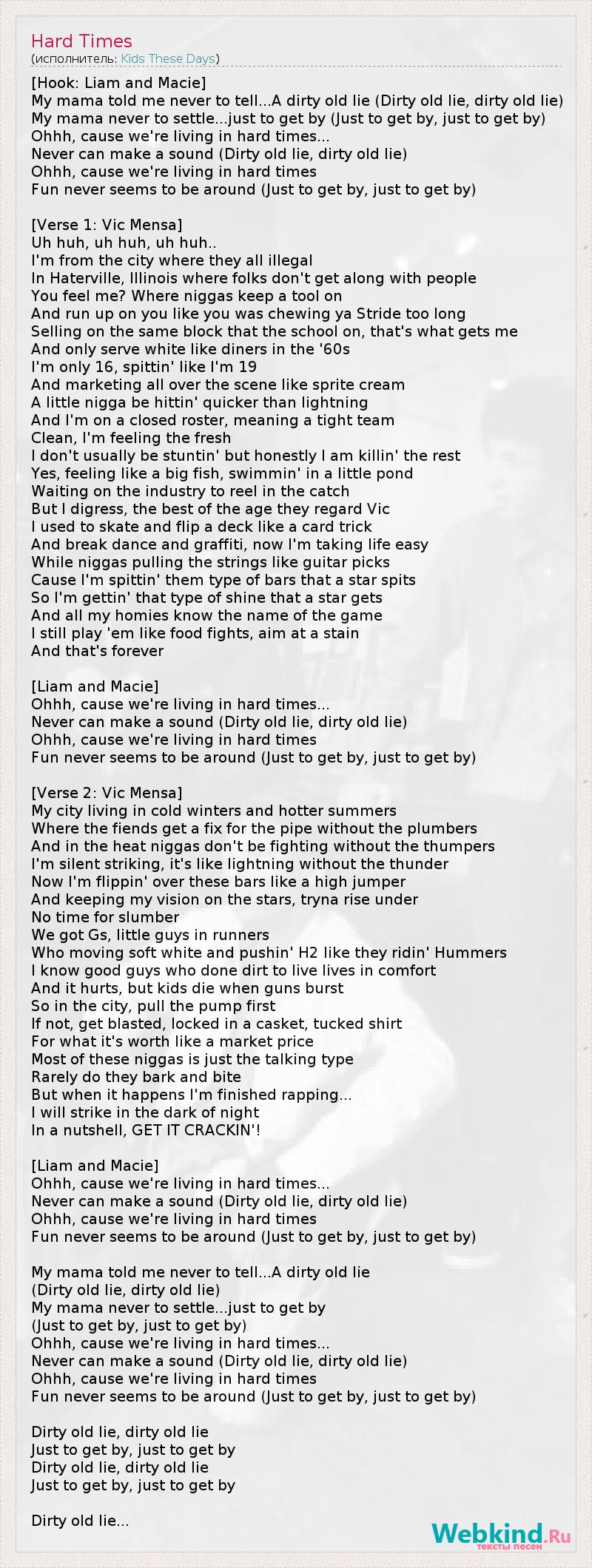[Hook: Liam and Macie] My mama told me never to tell...A dirty old lie (Dirty old lie, dirty old lie) My mama never to settle...just to get by (Just to get by, just to get by) Ohhh, cause we're living in hard times... Never can make a sound (Dirty old lie, dirty old lie) Ohhh, cause we're living in hard times Fun never seems to be around (Just to get by, just to get by) [Verse 1: Vic Mensa] Uh huh, uh huh, uh huh.. I'm from the city where they all illegal In Haterville, Illinois where folks don't get along with people You feel me? Where niggas keep a tool on And run up on you like you was chewing ya Stride too long Selling on the same block that the school on, that's what gets me And only serve white like diners in the '60s I'm only 16, spittin' like I'm 19 And marketing all over the scene like sprite cream A little nigga be hittin' quicker than lightning And I'm on a closed roster, meaning a tight team Clean, I'm feeling the fresh I don't usually be stuntin' but honestly I am killin' the rest Yes, feeling like a big fish, swimmin' in a little pond Waiting on the industry to reel in the catch But I digress, the best of the age they regard Vic I used to skate and flip a deck like a card trick And break dance and graffiti, now I'm taking life easy While niggas pulling the strings like guitar picks Cause I'm spittin' them type of bars that a star spits So I'm gettin' that type of shine that a star gets And all my homies know the name of the game I still play 'em like food fights, aim at a stain And that's forever [Liam and Macie] Ohhh, cause we're living in hard times... Never can make a sound (Dirty old lie, dirty old lie) Ohhh, cause we're living in hard times Fun never seems to be around (Just to get by, just to get by) [Verse 2: Vic Mensa] My city living in cold winters and hotter summers Where the fiends get a fix for the pipe without the plumbers And in the heat niggas don't be fighting without the thumpers I'm silent striking, it's like lightning without the thunder Now I'm flippin' over these bars like a high jumper And keeping my vision on the stars, tryna rise under No time for slumber We got Gs, little guys in runners Who moving soft white and pushin' H2 like they ridin' Hummers I know good guys who done dirt to live lives in comfort And it hurts, but kids die when guns burst So in the city, pull the pump first If not, get blasted, locked in a casket, tucked shirt For what it's worth like a market price Most of these niggas is just the talking type Rarely do they bark and bite But when it happens I'm finished rapping... I will strike in the dark of night In a nutshell, GET IT CRACKIN'! [Liam and Macie] Ohhh, cause we're living in hard times... Never can make a sound (Dirty old lie, dirty old lie) Ohhh, cause we're living in hard times Fun never seems to be around (Just to get by, just to get by) My mama told me never to tell...A dirty old lie (Dirty old lie, dirty old lie) My mama never to settle...just to get by (Just to get by, just to get by) Ohhh, cause we're living in hard times... Never can make a sound (Dirty old lie, dirty old lie) Ohhh, cause we're living in hard times Fun never seems to be around (Just to get by, just to get by) Dirty old lie, dirty old lie Just to get by, just to get by Dirty old lie, dirty old lie Just to get by, just to get by Dirty old lie...