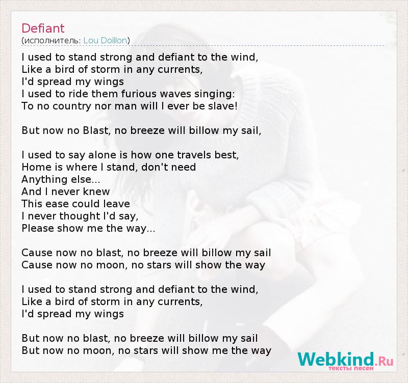 I used to stand strong and defiant to the wind, Like a bird of storm in any currents, I'd spread my wings I used to ride them furious waves singing: To no country nor man will I ever be slave! But now no Blast, no breeze will billow my sail, I used to say alone is how one travels best, Home is where I stand, don't need Anything else... And I never knew This ease could leave I never thought I'd say, Please show me the way... Cause now no blast, no breeze will billow my sail Cause now no moon, no stars will show the way I used to stand strong and defiant to the wind, Like a bird of storm in any currents, I'd spread my wings But now no blast, no breeze will billow my sail But now no moon, no stars will show me the way