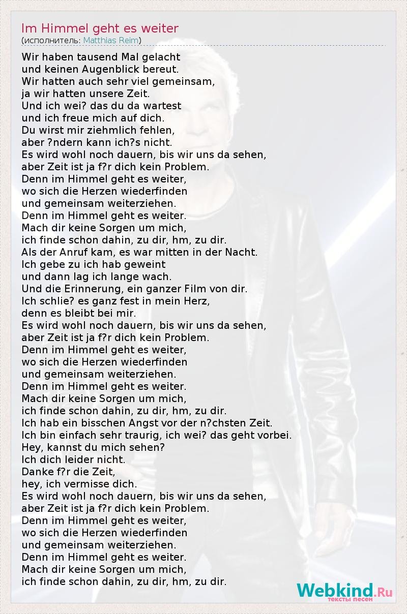 Wir Haben Tausend Mal gelacht унд Keinen Augenblick bereut . Wir Hatten Ош Sehr Вьель gemeinsam , JA Wir Hatten Unsere Zeit . Und Ich вэй ? Das дю -да wartest унд Ich freue Мичиган Auf Dich . Du Wirst мир ziehmlich fehlen , Абер ? ndern канн ич ? С Nicht . Es Wird Уолл Ночь dauern , бис Wir UNS да Sehen , Абер Zeit IST JA F ? R Dich Kein проблемы. Denn -им HIMMEL Geht -эс- Weiter , горе Сич умереть Герцена wiederfinden унд gemeinsam weiterziehen . Denn им Himmel Geht ES Weiter . Mach реж Keine Sorgen мкм штат Мичиган , Ich Finde Шон dahin , цу Дир, хм, цу реж. Als дер Anruf кам , ES войны варежку в дер Nacht . Ich Гебе цу Ich Жил geweint Und Данн отставать Ich Ланге Вах . Und умереть Erinnerung Эйн Ганзер Фильм фон реж. Ich SCHLIE ? ES Ганц праздник в Mein Herz , Denn -эс- Bleibt Bei Mir . Es Wird Уолл Ночь dauern , бис Wir UNS да Sehen , Абер Zeit IST JA F ? R Dich Kein проблемы. Denn -им HIMMEL Geht -эс- Weiter , горе Сич умереть Герцена wiederfinden унд gemeinsam weiterziehen . Denn им Himmel Geht ES Weiter . Mach реж Keine Sorgen мкм штат Мичиган , Ich Finde Шон dahin , цу Дир, хм, цу реж. Ich Жил Эйн bisschen Angst вор -дер- н ? Chsten Zeit . Ich бен Einfach Sehr Traurig , Ich вэй ? Das Geht Vorbei . Эй, kannst дю Мичиган Sehen ? Ich Dich Leider Nicht . Danke F ? R Die Zeit , эй, Ich vermisse Dich . Es Wird Уолл Ночь dauern , бис Wir UNS да Sehen , Абер Zeit IST JA F ? R Dich Kein проблемы. Denn -им HIMMEL Geht -эс- Weiter , горе Сич умереть Герцена wiederfinden унд gemeinsam weiterziehen . Denn им Himmel Geht ES Weiter . Mach реж Keine Sorgen мкм штат Мичиган , Ich Finde Шон dahin , цу Дир, хм, цу реж.