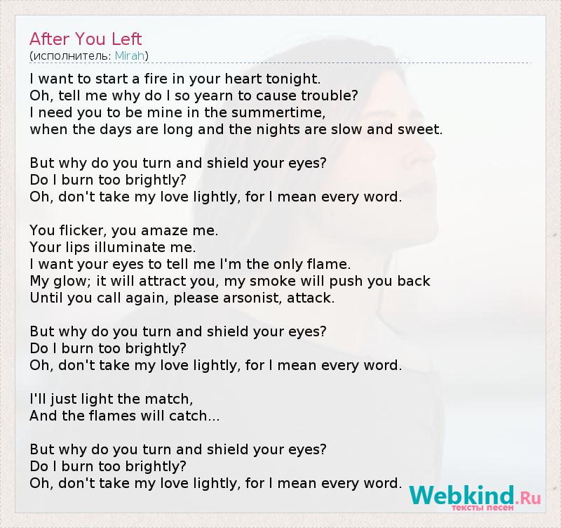 I want to start a fire in your heart tonight. Oh, tell me why do I so yearn to cause trouble? I need you to be mine in the summertime, when the days are long and the nights are slow and sweet. But why do you turn and shield your eyes? Do I burn too brightly? Oh, don't take my love lightly, for I mean every word. You flicker, you amaze me. Your lips illuminate me. I want your eyes to tell me I'm the only flame. My glow; it will attract you, my smoke will push you back Until you call again, please arsonist, attack. But why do you turn and shield your eyes? Do I burn too brightly? Oh, don't take my love lightly, for I mean every word. I'll just light the match, And the flames will catch... But why do you turn and shield your eyes? Do I burn too brightly? Oh, don't take my love lightly, for I mean every word.