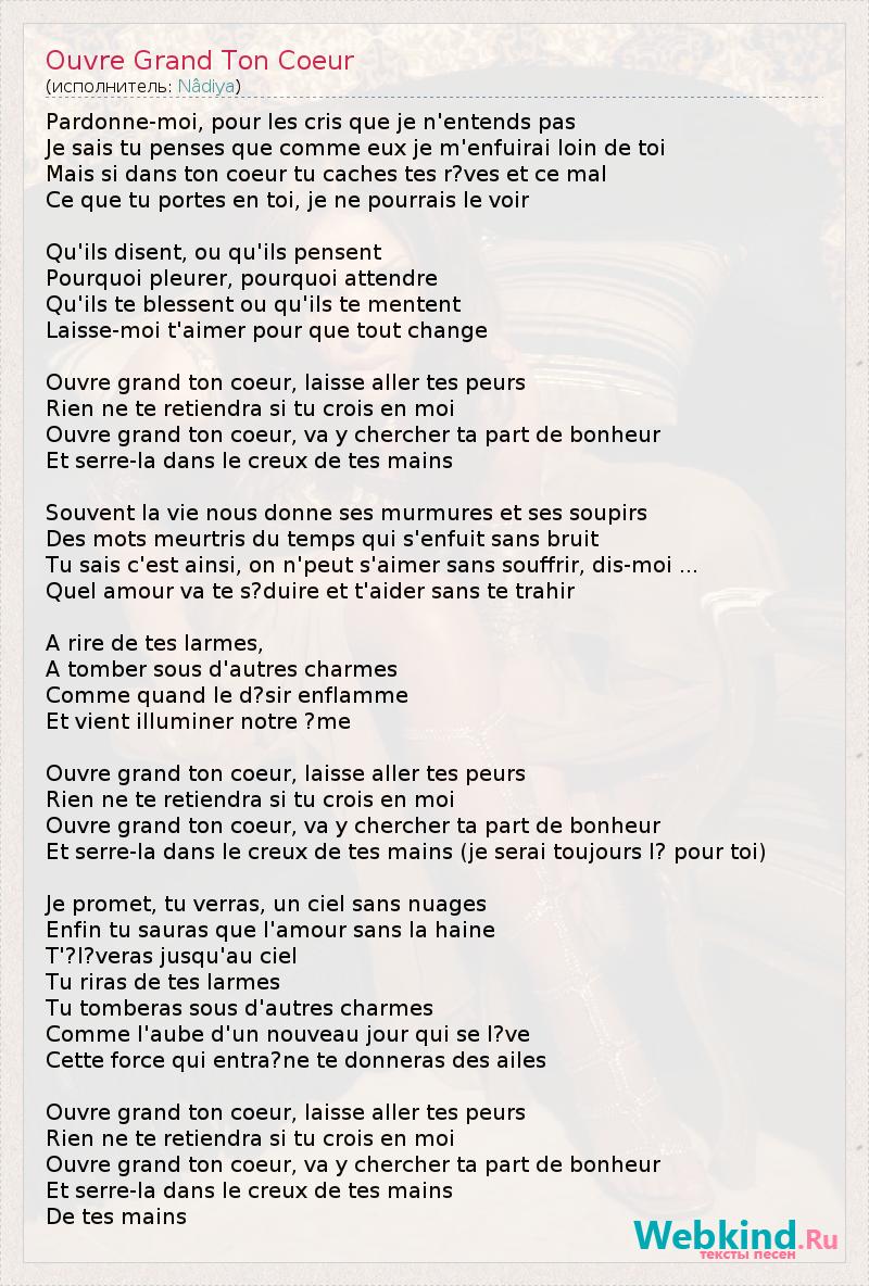 Pardonne-moi, pour les cris que je n'entends pas Je sais tu penses que comme eux je m'enfuirai loin de toi Mais si dans ton coeur tu caches tes r?ves et ce mal Ce que tu portes en toi, je ne pourrais le voir Qu'ils disent, ou qu'ils pensent Pourquoi pleurer, pourquoi attendre Qu'ils te blessent ou qu'ils te mentent Laisse-moi t'aimer pour que tout change Ouvre grand ton coeur, laisse aller tes peurs Rien ne te retiendra si tu crois en moi Ouvre grand ton coeur, va y chercher ta part de bonheur Et serre-la dans le creux de tes mains Souvent la vie nous donne ses murmures et ses soupirs Des mots meurtris du temps qui s'enfuit sans bruit Tu sais c'est ainsi, on n'peut s'aimer sans souffrir, dis-moi ... Quel amour va te s?duire et t'aider sans te trahir A rire de tes larmes, A tomber sous d'autres charmes Comme quand le d?sir enflamme Et vient illuminer notre ?me Ouvre grand ton coeur, laisse aller tes peurs Rien ne te retiendra si tu crois en moi Ouvre grand ton coeur, va y chercher ta part de bonheur Et serre-la dans le creux de tes mains (je serai toujours l? pour toi) Je promet, tu verras, un ciel sans nuages Enfin tu sauras que l'amour sans la haine T'?l?veras jusqu'au ciel Tu riras de tes larmes Tu tomberas sous d'autres charmes Comme l'aube d'un nouveau jour qui se l?ve Cette force qui entra?ne te donneras des ailes Ouvre grand ton coeur, laisse aller tes peurs Rien ne te retiendra si tu crois en moi Ouvre grand ton coeur, va y chercher ta part de bonheur Et serre-la dans le creux de tes mains De tes mains