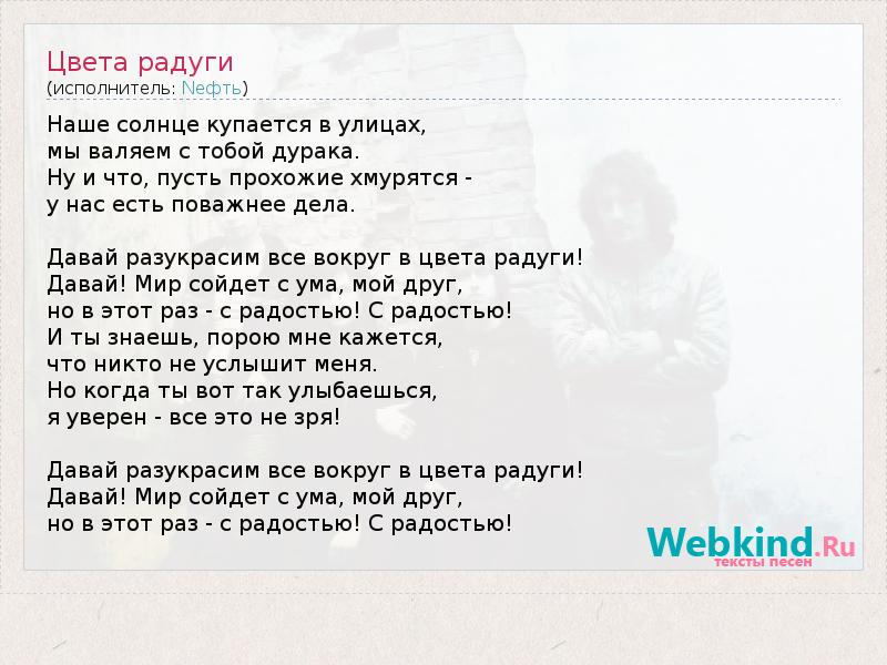 Наше солнце купается в улицах, мы валяем с тобой дурака. Ну и что, пусть прохожие хмурятся - у нас есть поважнее дела. Давай разукрасим все вокруг в цвета радуги! Давай! Мир сойдет с ума, мой друг, но в этот раз - с радостью! С радостью! И ты знаешь, порою мне кажется, что никто не услышит меня. Но когда ты вот так улыбаешься, я уверен - все это не зря! Давай разукрасим все вокруг в цвета радуги! Давай! Мир сойдет с ума, мой друг, но в этот раз - с радостью! С радостью!