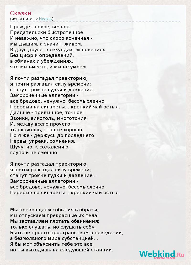Прежде - новое, вечное. Предательски быстротечное. И неважно, что скоро конечная - мы дышим, а значит, живем. В друг друге, в секундах, мгновениях. Без цифр и определений, в обманах и убеждениях, что мы вместе, и мы не умрем. Я почти разгадал траекторию, я почти разгадал силу времени; станут громче гудки и давление... Замороченные аллегории - все бредово, ненужно, бессмысленно. Перерыв на сигареты... крепкий чай остыл. Дальше - привычное, точное. Звонки, алкоголь, многоточия. И, между всего прочего, ты скажешь, что все хорошо. Но я же - держусь до последнего. Нервы, упреки, сомнения. Шучу, но, к сожалению, глупо и не смешно. Я почти разгадал траекторию, я почти разгадал силу времени; станут громче гудки и давление... Замороченные аллегории - все бредово, ненужно, бессмысленно. Перерыв на сигареты... крепкий чай остыл. Мы превращаем события в образы, мы отпускаем прекрасные их тела. Мы заставляем глотать обвинения; только слушать, но слушать себя. Быть не просто пространством в неведении, а безмолвного мира субстанцией... Я бы мог объяснить тебе это все, но ты выходишь на следующей станции.