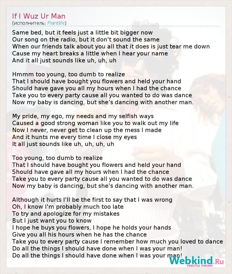 Та же кровать, но теперь она кажется немножко больше; Наша песня на радио, но она звучит по-другому. Когда наши друзья говорят о тебе, я понимаю, как я разбит; Ведь мое сердце понемножку дает трещины, когда я слышу твое имя. И слышны только звуки ууу... Слишком молод, слишком глуп был, чтобы догадаться Купить тебе цветы и взять тебя за руку. Нужно было тратить на тебя все свое время, когда была возможность, Брать тебя на каждую вечеринку, ведь все, что ты хотела, - это танцевать. Теперь моя малышка танцует, но она танцует с другим мужчиной. Моя гордость, мое самолюбие, мои нужды и моя корысть Стали причиной, по которой хорошая сильная женщина, ты, ушла из моей жизни. Теперь же у меня никогда не будет шанса исправить все то, что я натворил; И каждый раз, как я закрываю глаза, эти мысли преследуют меня. И раздается только ууу... Слишком молод, слишком глуп был, чтобы догадаться Купить тебе цветы и взять тебя за руку. Нужно было тратить на тебя все свое время, когда была возможность, Брать тебя на каждую вечеринку, ведь все, что ты хотела, - это танцевать. Теперь моя малышка танцует, но она танцует с другим мужчиной. И хотя больно, но я первым признаю, что был неправ. О я знаю, что возможно теперь уже поздно Попытаться и извиниться за мои ошибки, Но я только хочу, чтобы ты знала. Я надеюсь, он дарит тебе цветы, надеюсь, он держит тебя за руки, Посвящает тебе все свое время по возможности, Берет тебя на вечеринки, ведь я помню, как сильно ты любила танцевать, Делает все то, что мне нужно было делать, когда я был твоим мужчиной! Делает все то, что мне нужно было делать, когда я был твоим мужчиной!