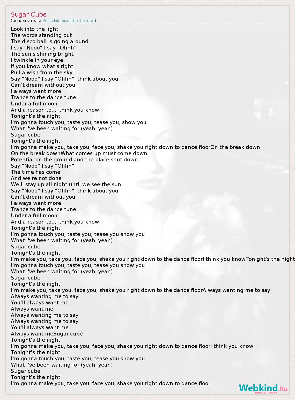 Look into the light The words standing out The disco ball is going around I say "Nooo" I say "Ohhh" The sun's shining bright I twinkle in your eye If you know what's right Pull a wish from the sky Say "Nooo" I say "Ohhh"I think about you Can't dream without you I always want more Trance to the dance tune Under a full moon And a reason to...I think you know Tonight's the night I'm gonna touch you, taste you, tease you, show you What I've been waiting for (yeah, yeah) Sugar cube Tonight's the night I'm gonna make you, take you, face you, shake you right down to dance floorOn the break down On the break downWhat comes up must come down Potential on the ground and the place shut down Say "Nooo" I say "Ohhh" The time has come And we're not done We'll stay up all night until we see the sun Say "Nooo" I say "Ohhh"I think about you Can't dream without you I always want more Trance to the dance tune Under a full moon And a reason to...I think you know Tonight's the night I'm gonna touch you, taste you, tease you show you What I've been waiting for (yeah, yeah) Sugar cube Tonight's the night I'm make you, take you, face you, shake you right down to the dance floorI think you knowTonight's the night I'm gonna touch you, taste you, tease you show you What I've been waiting for (yeah, yeah) Sugar cube Tonight's the night I'm make you, take you, face you, shake you right down to the dance floorAlways wanting me to say Always wanting me to say You'll always want me Always want me Always wanting me to say Always wanting me to say You'll always want me Always want meSugar cube Tonight's the night I'm gonna make you, take you, face you, shake you right down to dance floorI think you know Tonight's the night I'm gonna touch you, taste you, tease you show you What I've been waiting for (yeah, yeah) Sugar cube Tonight's the night I'm gonna make you, take you, face you, shake you right down to dance floor