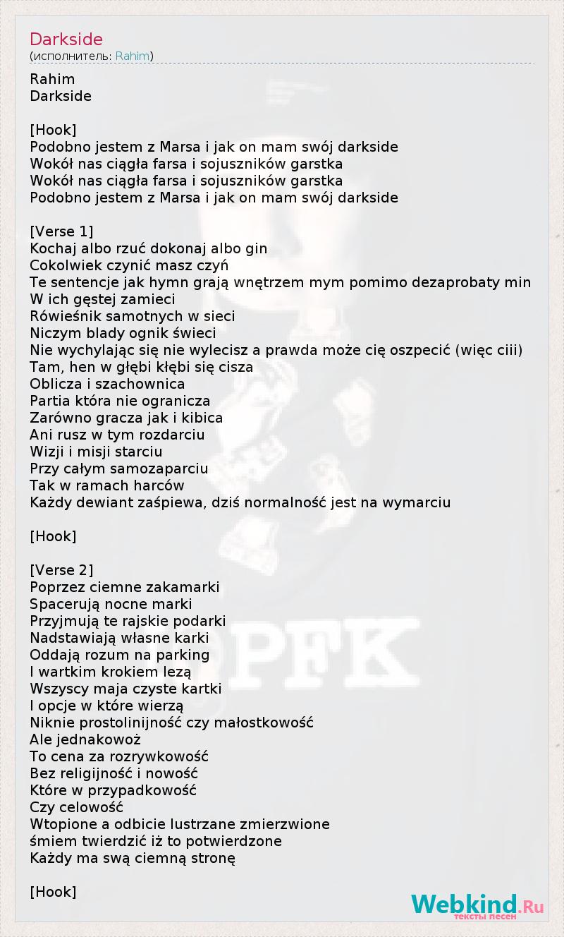 Rahim Darkside [Hook] Podobno jestem z Marsa i jak on mam swój darkside Wokół nas ciągła farsa i sojuszników garstka Wokół nas ciągła farsa i sojuszników garstka Podobno jestem z Marsa i jak on mam swój darkside [Verse 1] Kochaj albo rzuć dokonaj albo gin Cokolwiek czynić masz czyń Te sentencje jak hymn grają wnętrzem mym pomimo dezaprobaty min W ich gęstej zamieci Rówieśnik samotnych w sieci Niczym blady ognik świeci Nie wychylając się nie wylecisz a prawda może cię oszpecić (więc ciii) Tam, hen w głębi kłębi się cisza Oblicza i szachownica Partia która nie ogranicza Zarówno gracza jak i kibica Ani rusz w tym rozdarciu Wizji i misji starciu Przy całym samozaparciu Tak w ramach harców Każdy dewiant zaśpiewa, dziś normalność jest na wymarciu [Hook] [Verse 2] Poprzez ciemne zakamarki Spacerują nocne marki Przyjmują te rajskie podarki Nadstawiają własne karki Oddają rozum na parking I wartkim krokiem lezą Wszyscy maja czyste kartki I opcje w które wierzą Niknie prostolinijność czy małostkowość Ale jednakowoż To cena za rozrywkowość Bez religijność i nowość Które w przypadkowość Czy celowość Wtopione a odbicie lustrzane zmierzwione śmiem twierdzić iż to potwierdzone Każdy ma swą ciemną stronę [Hook]