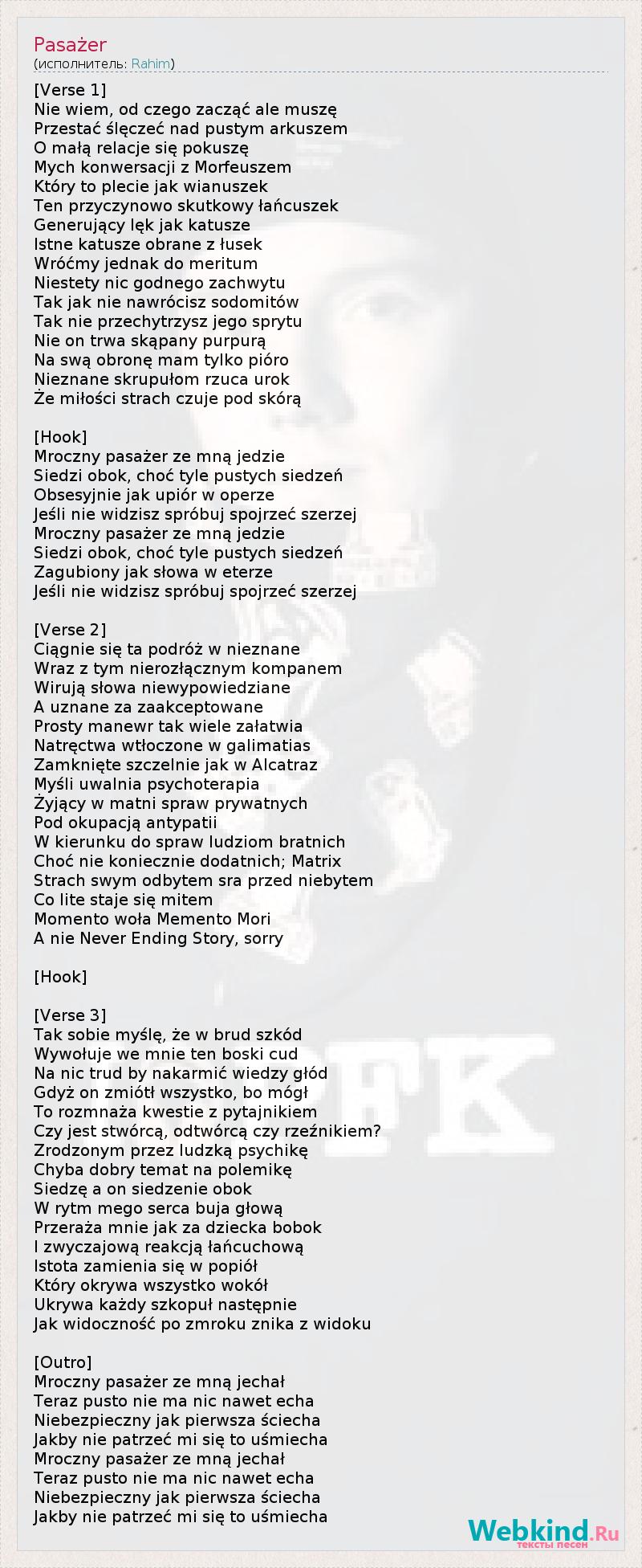 [Verse 1] Nie wiem, od czego zacząć ale muszę Przestać ślęczeć nad pustym arkuszem O małą relacje się pokuszę Mych konwersacji z Morfeuszem Który to plecie jak wianuszek Ten przyczynowo skutkowy łańcuszek Generujący lęk jak katusze Istne katusze obrane z łusek Wróćmy jednak do meritum Niestety nic godnego zachwytu Tak jak nie nawrócisz sodomitów Tak nie przechytrzysz jego sprytu Nie on trwa skąpany purpurą Na swą obronę mam tylko pióro Nieznane skrupułom rzuca urok Że miłości strach czuje pod skórą [Hook] Mroczny pasażer ze mną jedzie Siedzi obok, choć tyle pustych siedzeń Obsesyjnie jak upiór w operze Jeśli nie widzisz spróbuj spojrzeć szerzej Mroczny pasażer ze mną jedzie Siedzi obok, choć tyle pustych siedzeń Zagubiony jak słowa w eterze Jeśli nie widzisz spróbuj spojrzeć szerzej [Verse 2] Ciągnie się ta podróż w nieznane Wraz z tym nierozłącznym kompanem Wirują słowa niewypowiedziane A uznane za zaakceptowane Prosty manewr tak wiele załatwia Natręctwa wtłoczone w galimatias Zamknięte szczelnie jak w Alcatraz Myśli uwalnia psychoterapia Żyjący w matni spraw prywatnych Pod okupacją antypatii W kierunku do spraw ludziom bratnich Choć nie koniecznie dodatnich; Matrix Strach swym odbytem sra przed niebytem Co lite staje się mitem Momento woła Memento Mori A nie Never Ending Story, sorry [Hook] [Verse 3] Tak sobie myślę, że w brud szkód Wywołuje we mnie ten boski cud Na nic trud by nakarmić wiedzy głód Gdyż on zmiótł wszystko, bo mógł To rozmnaża kwestie z pytajnikiem Czy jest stwórcą, odtwórcą czy rzeźnikiem? Zrodzonym przez ludzką psychikę Chyba dobry temat na polemikę Siedzę a on siedzenie obok W rytm mego serca buja głową Przeraża mnie jak za dziecka bobok I zwyczajową reakcją łańcuchową Istota zamienia się w popiół Który okrywa wszystko wokół Ukrywa każdy szkopuł następnie Jak widoczność po zmroku znika z widoku [Outro] Mroczny pasażer ze mną jechał Teraz pusto nie ma nic nawet echa Niebezpieczny jak pierwsza ściecha Jakby nie patrzeć mi się to uśmiecha Mroczny pasażer ze mną jechał Teraz pusto nie ma nic nawet echa Niebezpieczny jak pierwsza ściecha Jakby nie patrzeć mi się to uśmiecha