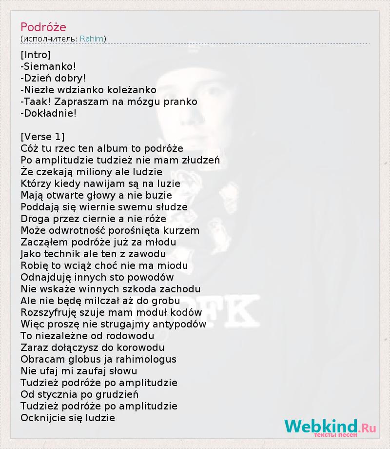 [Intro] -Siemanko! -Dzień dobry! -Niezłe wdzianko koleżanko -Taak! Zapraszam na mózgu pranko -Dokładnie! [Verse 1] Cóż tu rzec ten album to podróże Po amplitudzie tudzież nie mam złudzeń Że czekają miliony ale ludzie Którzy kiedy nawijam są na luzie Mają otwarte głowy a nie buzie Poddają się wiernie swemu słudze Droga przez ciernie a nie róże Może odwrotność porośnięta kurzem Zacząłem podróże już za młodu Jako technik ale ten z zawodu Robię to wciąż choć nie ma miodu Odnajduję innych sto powodów Nie wskaże winnych szkoda zachodu Ale nie będę milczał aż do grobu Rozszyfruję szuje mam moduł kodów Więc proszę nie strugajmy antypodów To niezależne od rodowodu Zaraz dołączysz do korowodu Obracam globus ja rahimologus Nie ufaj mi zaufaj słowu Tudzież podróże po amplitudzie Od stycznia po grudzień Tudzież podróże po amplitudzie Ocknijcie się ludzie