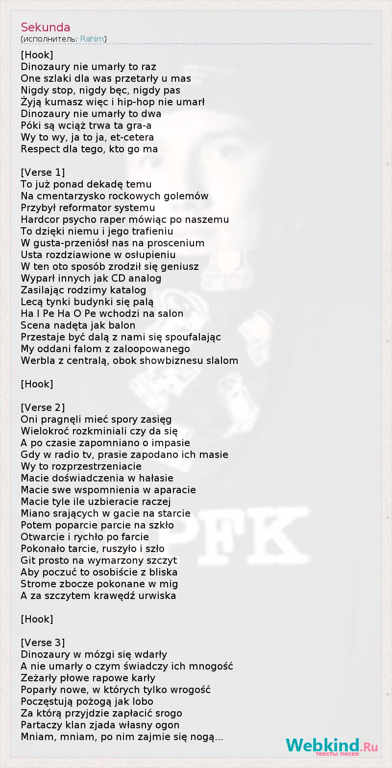 [Hook] Dinozaury nie umarły to raz One szlaki dla was przetarły u mas Nigdy stop, nigdy bęc, nigdy pas Żyją kumasz więc i hip-hop nie umarł Dinozaury nie umarły to dwa Póki są wciąż trwa ta gra-a Wy to wy, ja to ja, et-cetera Respect dla tego, kto go ma [Verse 1] To już ponad dekadę temu Na cmentarzysko rockowych golemów Przybył reformator systemu Hardcor psycho raper mówiąc po naszemu To dzięki niemu i jego trafieniu W gusta-przeniósł nas na proscenium Usta rozdziawione w osłupieniu W ten oto sposób zrodził się geniusz Wyparł innych jak CD analog Zasilając rodzimy katalog Lecą tynki budynki się palą Ha I Pe Ha O Pe wchodzi na salon Scena nadęta jak balon Przestaje być dalą z nami się spoufalając My oddani falom z zaloopowanego Werbla z centralą, obok showbiznesu slalom [Hook] [Verse 2] Oni pragnęli mieć spory zasięg Wielokroć rozkminiali czy da się A po czasie zapomniano o impasie Gdy w radio tv, prasie zapodano ich masie Wy to rozprzestrzeniacie Macie doświadczenia w hałasie Macie swe wspomnienia w aparacie Macie tyle ile uzbieracie raczej Miano srających w gacie na starcie Potem poparcie parcie na szkło Otwarcie i rychło po farcie Pokonało tarcie, ruszyło i szło Git prosto na wymarzony szczyt Aby poczuć to osobiście z bliska Strome zbocze pokonane w mig A za szczytem krawędź urwiska [Hook] [Verse 3] Dinozaury w mózgi się wdarły A nie umarły o czym świadczy ich mnogość Zeżarły płowe rapowe karły Poparły nowe, w których tylko wrogość Poczęstują pożogą jak lobo Za którą przyjdzie zapłacić srogo Partaczy klan zjada własny ogon Mniam, mniam, po nim zajmie się nogą...