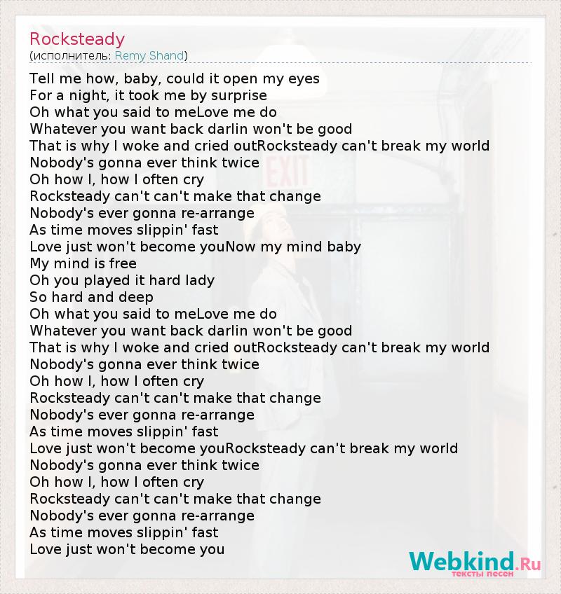 Tell me how, baby, could it open my eyes For a night, it took me by surprise Oh what you said to meLove me do Whatever you want back darlin won't be good That is why I woke and cried outRocksteady can't break my world Nobody's gonna ever think twice Oh how I, how I often cry Rocksteady can't can't make that change Nobody's ever gonna re-arrange As time moves slippin' fast Love just won't become youNow my mind baby My mind is free Oh you played it hard lady So hard and deep Oh what you said to meLove me do Whatever you want back darlin won't be good That is why I woke and cried outRocksteady can't break my world Nobody's gonna ever think twice Oh how I, how I often cry Rocksteady can't can't make that change Nobody's ever gonna re-arrange As time moves slippin' fast Love just won't become youRocksteady can't break my world Nobody's gonna ever think twice Oh how I, how I often cry Rocksteady can't can't make that change Nobody's ever gonna re-arrange As time moves slippin' fast Love just won't become you