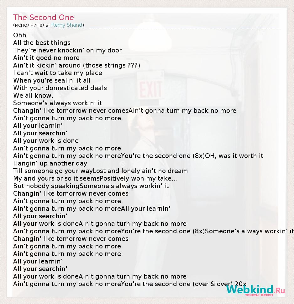 Ohh All the best things They're never knockin' on my door Ain't it good no more Ain't it kickin' around (those strings ???) I can't wait to take my place When you're sealin' it all With your domesticated deals We all know, Someone's always workin' it Changin' like tomorrow never comesAin't gonna turn my back no more Ain't gonna turn my back no more All your learnin' All your searchin' All your work is done Ain't gonna turn my back no more Ain't gonna turn my back no moreYou're the second one (8x)OH, was it worth it Hangin' up another day Till someone go your wayLost and lonely ain't no dream My and yours or so it seemsPositively won my take... But nobody speakingSomeone's always workin' it Changin' like tomorrow never comes Ain't gonna turn my back no more Ain't gonna turn my back no moreAll your learnin' All your searchin' All your work is doneAin't gonna turn my back no more Ain't gonna turn my back no moreYou're the second one (8x)Someone's always workin' it Changin' like tomorrow never comes Ain't gonna turn my back no more Ain't gonna turn my back no more All your learnin' All your searchin' All your work is doneAin't gonna turn my back no more Ain't gonna turn my back no moreYou're the second one (over & over) 20x