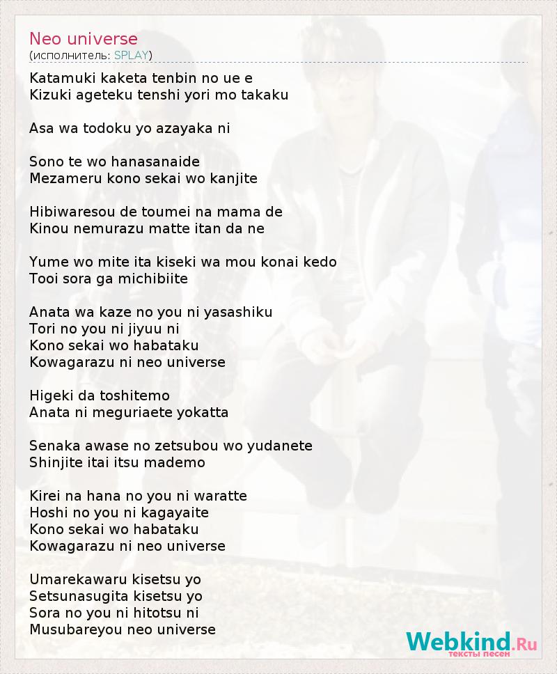 Katamuki kaketa tenbin no ue e Kizuki ageteku tenshi yori mo takaku Asa wa todoku yo azayaka ni Sono te wo hanasanaide Mezameru kono sekai wo kanjite Hibiwaresou de toumei na mama de Kinou nemurazu matte itan da ne Yume wo mite ita kiseki wa mou konai kedo Tooi sora ga michibiite Anata wa kaze no you ni yasashiku Tori no you ni jiyuu ni Kono sekai wo habataku Kowagarazu ni neo universe Higeki da toshitemo Anata ni meguriaete yokatta Senaka awase no zetsubou wo yudanete Shinjite itai itsu mademo Kirei na hana no you ni waratte Hoshi no you ni kagayaite Kono sekai wo habataku Kowagarazu ni neo universe Umarekawaru kisetsu yo Setsunasugita kisetsu yo Sora no you ni hitotsu ni Musubareyou neo universe