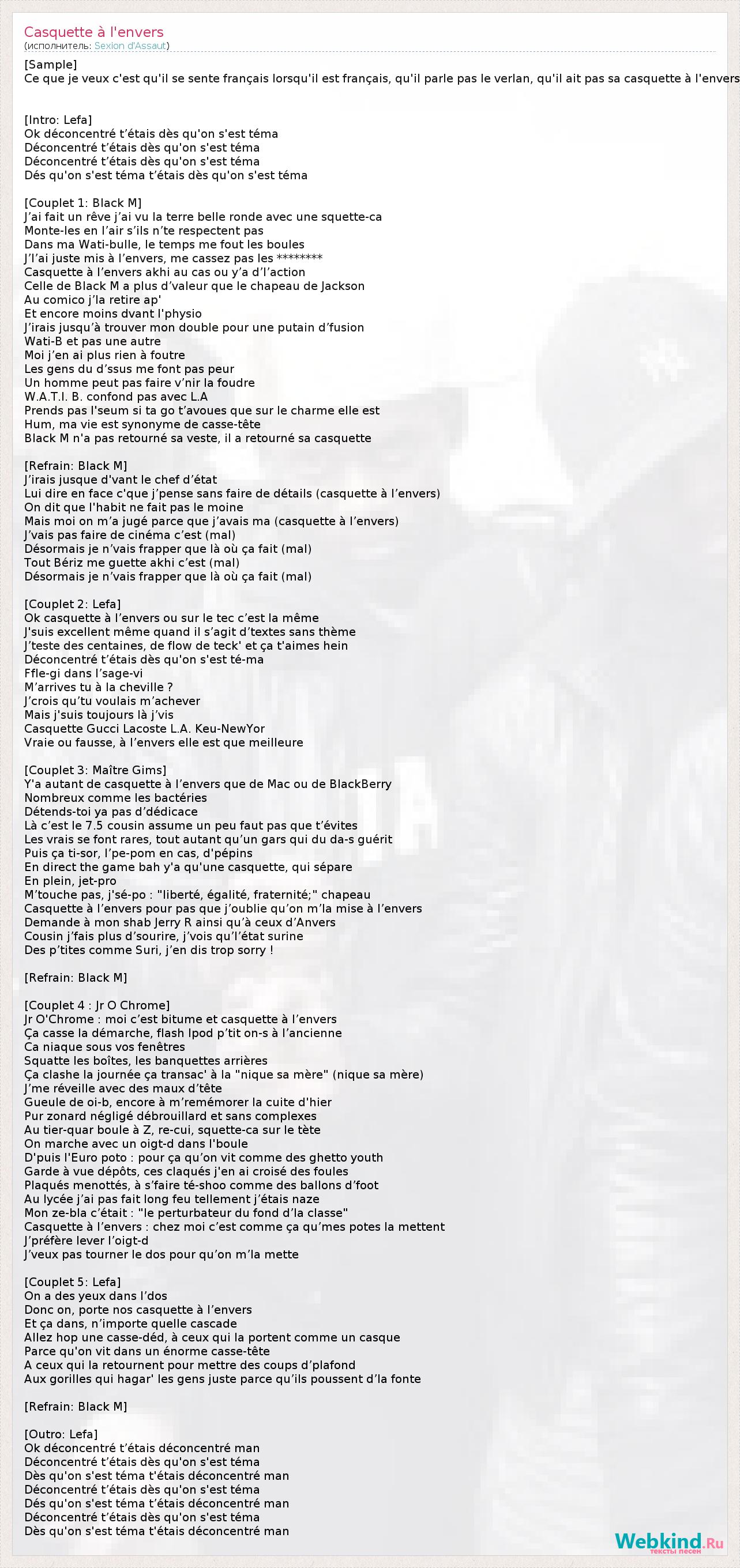 [Sample] Ce que je veux c'est qu'il se sente français lorsqu'il est français, qu'il parle pas le verlan, qu'il ait pas sa casquette à l'envers [Intro: Lefa] Ok déconcentré t’étais dès qu'on s'est téma Déconcentré t’étais dès qu'on s'est téma Déconcentré t’étais dès qu'on s'est téma Dés qu'on s'est téma t’étais dès qu'on s'est téma [Couplet 1: Black M] J’ai fait un rêve j’ai vu la terre belle ronde avec une squette-ca Monte-les en l’air s’ils n’te respectent pas Dans ma Wati-bulle, le temps me fout les boules J’l’ai juste mis à l’envers, me cassez pas les ******** Casquette à l’envers akhi au cas ou y’a d’l’action Celle de Black M a plus d’valeur que le chapeau de Jackson Au comico j’la retire ap' Et encore moins dvant l'physio J’irais jusqu’à trouver mon double pour une putain d’fusion Wati-B et pas une autre Moi j’en ai plus rien à foutre Les gens du d’ssus me font pas peur Un homme peut pas faire v’nir la foudre W.A.T.I. B. confond pas avec L.A Prends pas l'seum si ta go t’avoues que sur le charme elle est Hum, ma vie est synonyme de casse-tête Black M n'a pas retourné sa veste, il a retourné sa casquette [Refrain: Black M] J’irais jusque d'vant le chef d’état Lui dire en face c'que j’pense sans faire de détails (casquette à l’envers) On dit que l'habit ne fait pas le moine Mais moi on m’a jugé parce que j’avais ma (casquette à l’envers) J’vais pas faire de cinéma c’est (mal) Désormais je n’vais frapper que là où ça fait (mal) Tout Bériz me guette akhi c’est (mal) Désormais je n’vais frapper que là où ça fait (mal) [Couplet 2: Lefa] Ok casquette à l’envers ou sur le tec c’est la même J'suis excellent même quand il s’agit d’textes sans thème J’teste des centaines, de flow de teck' et ça t'aimes hein Déconcentré t’étais dès qu'on s'est té-ma Ffle-gi dans l’sage-vi M’arrives tu à la cheville ? J’crois qu’tu voulais m’achever Mais j'suis toujours là j’vis Casquette Gucci Lacoste L.A. Keu-NewYor Vraie ou fausse, à l’envers elle est que meilleure [Couplet 3: Maître Gims] Y'a autant de casquette à l’envers que de Mac ou de BlackBerry Nombreux comme les bactéries Détends-toi ya pas d’dédicace Là c’est le 7.5 cousin assume un peu faut pas que t’évites Les vrais se font rares, tout autant qu’un gars qui du da-s guérit Puis ça ti-sor, l’pe-pom en cas, d'pépins En direct the game bah y'a qu'une casquette, qui sépare En plein, jet-pro M’touche pas, j'sé-po : "liberté, égalité, fraternité;" chapeau Casquette à l’envers pour pas que j’oublie qu’on m’la mise à l’envers Demande à mon shab Jerry R ainsi qu’à ceux d’Anvers Cousin j’fais plus d’sourire, j’vois qu’l’état surine Des p’tites comme Suri, j’en dis trop sorry ! [Refrain: Black M] [Couplet 4 : Jr O Chrome] Jr O'Chrome : moi c’est bitume et casquette à l’envers Ça casse la démarche, flash Ipod p’tit on-s à l’ancienne Ca niaque sous vos fenêtres Squatte les boîtes, les banquettes arrières Ça clashe la journée ça transac' à la "nique sa mère" (nique sa mère) J’me réveille avec des maux d’tête Gueule de oi-b, encore à m’remémorer la cuite d'hier Pur zonard négligé débrouillard et sans complexes Au tier-quar boule à Z, re-cui, squette-ca sur le tète On marche avec un oigt-d dans l'boule D'puis l'Euro poto : pour ça qu’on vit comme des ghetto youth Garde à vue dépôts, ces claqués j'en ai croisé des foules Plaqués menottés, à s’faire té-shoo comme des ballons d’foot Au lycée j’ai pas fait long feu tellement j’étais naze Mon ze-bla c’était : "le perturbateur du fond d’la classe" Casquette à l’envers : chez moi c’est comme ça qu’mes potes la mettent J’préfère lever l’oigt-d J’veux pas tourner le dos pour qu’on m’la mette [Couplet 5: Lefa] On a des yeux dans l’dos Donc on, porte nos casquette à l’envers Et ça dans, n’importe quelle cascade Allez hop une casse-déd, à ceux qui la portent comme un casque Parce qu'on vit dans un énorme casse-tête A ceux qui la retournent pour mettre des coups d’plafond Aux gorilles qui hagar' les gens juste parce qu’ils poussent d’la fonte [Refrain: Black M] [Outro: Lefa] Ok déconcentré t’étais déconcentré man Déconcentré t’étais dès qu'on s'est téma Dès qu'on s'est téma t'étais déconcentré man Déconcentré t’étais dès qu'on s'est téma Dés qu'on s'est téma t’étais déconcentré man Déconcentré t’étais dès qu'on s'est téma Dès qu'on s'est téma t'étais déconcentré man