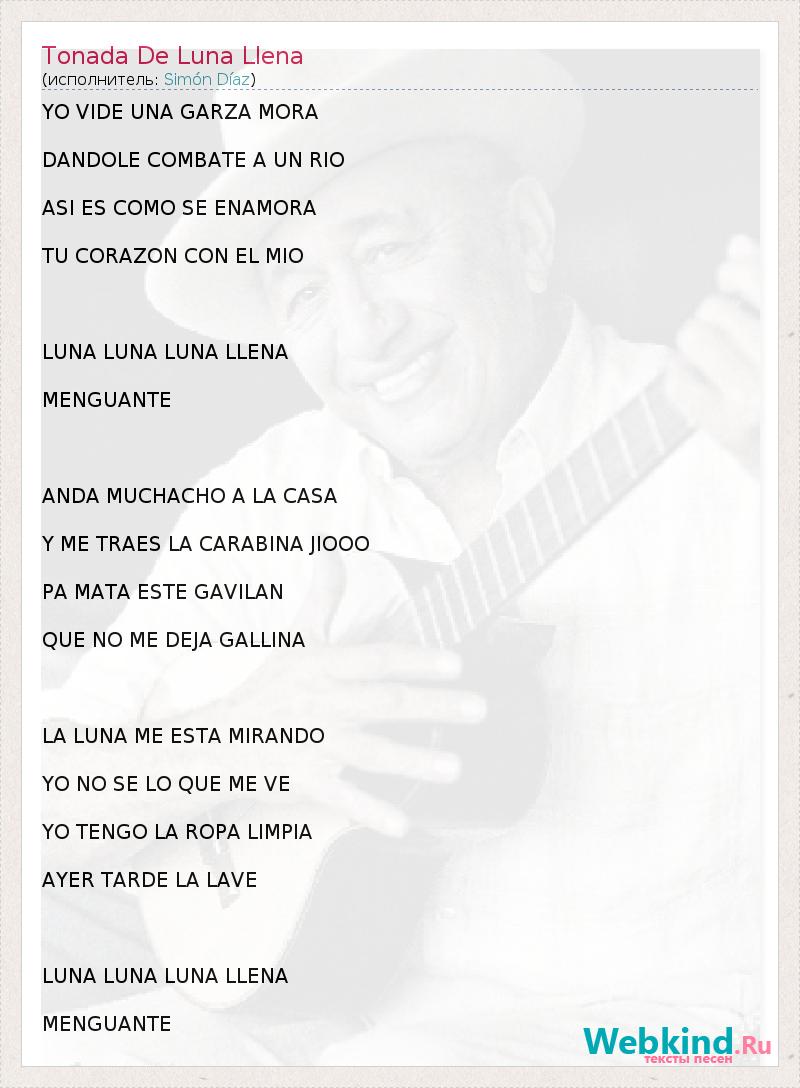 YO VIDE UNA GARZA MORA DANDOLE COMBATE A UN RIO ASI ES COMO SE ENAMORA TU CORAZON CON EL MIO LUNA LUNA LUNA LLENA MENGUANTE ANDA MUCHACHO A LA CASA Y ME TRAES LA CARABINA JIOOO PA MATA ESTE GAVILAN QUE NO ME DEJA GALLINA LA LUNA ME ESTA MIRANDO YO NO SE LO QUE ME VE YO TENGO LA ROPA LIMPIA AYER TARDE LA LAVE LUNA LUNA LUNA LLENA MENGUANTE