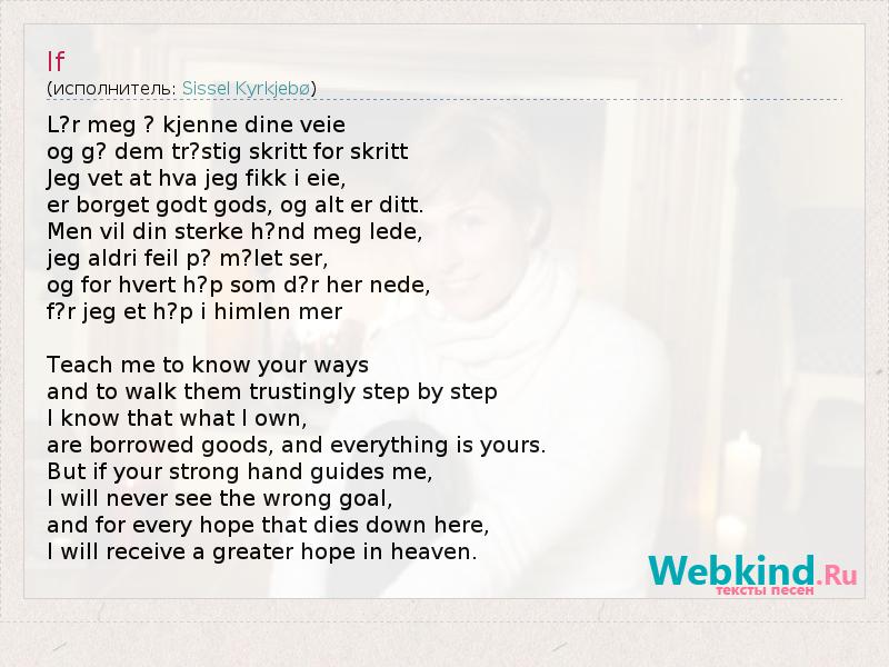 L?r meg ? kjenne dine veie og g? dem tr?stig skritt for skritt Jeg vet at hva jeg fikk i eie, er borget godt gods, og alt er ditt. Men vil din sterke h?nd meg lede, jeg aldri feil p? m?let ser, og for hvert h?p som d?r her nede, f?r jeg et h?p i himlen mer Teach me to know your ways and to walk them trustingly step by step I know that what I own, are borrowed goods, and everything is yours. But if your strong hand guides me, I will never see the wrong goal, and for every hope that dies down here, I will receive a greater hope in heaven.