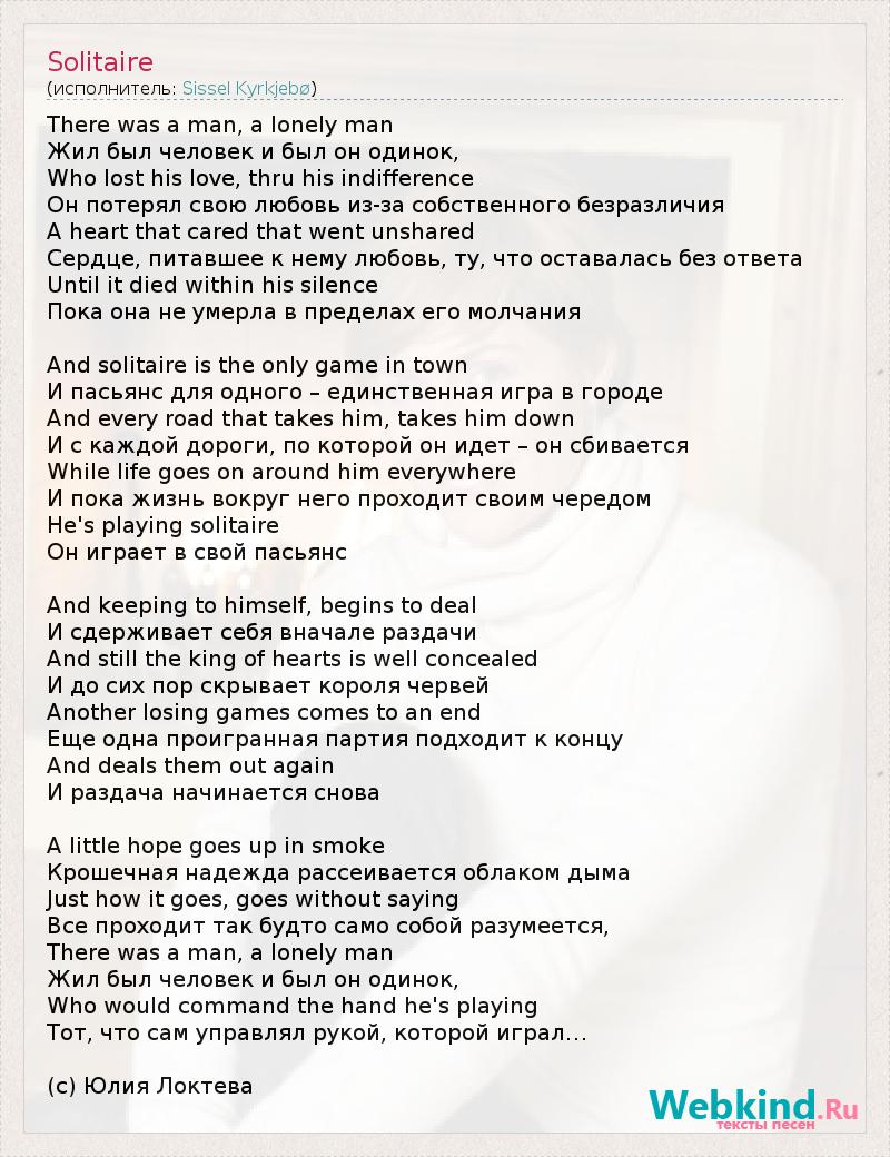 There was a man, a lonely man Жил был человек и был он одинок, Who lost his love, thru his indifference Он потерял свою любовь из-за собственного безразличия A heart that cared that went unshared Сердце, питавшее к нему любовь, ту, что оставалась без ответа Until it died within his silence Пока она не умерла в пределах его молчания And solitaire is the only game in town И пасьянс для одного – единственная игра в городе And every road that takes him, takes him down И с каждой дороги, по которой он идет – он сбивается While life goes on around him everywhere И пока жизнь вокруг него проходит своим чередом He's playing solitaire Он играет в свой пасьянс And keeping to himself, begins to deal И сдерживает себя вначале раздачи And still the king of hearts is well concealed И до сих пор скрывает короля червей Another losing games comes to an end Еще одна проигранная партия подходит к концу And deals them out again И раздача начинается снова A little hope goes up in smoke Крошечная надежда рассеивается облаком дыма Just how it goes, goes without saying Все проходит так будто само собой разумеется, There was a man, a lonely man Жил был человек и был он одинок, Who would command the hand he's playing Тот, что сам управлял рукой, которой играл… (c) Юлия Локтева