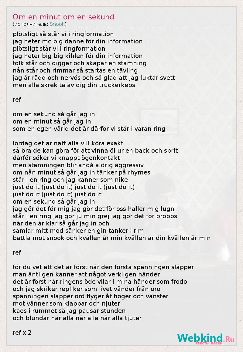 plötsligt så står vi i ringformation jag heter mc big danne för din information plötsligt står vi i ringformation jag heter big big kihlen för din information folk står och diggar och skapar en stämning nån står och rimmar så startas en tävling jag är rädd och nervös och så glad att jag luktar svett men alla skrek ta av dig din truckerkeps ref om en sekund så går jag in om en minut så går jag in som en egen värld det är därför vi står i våran ring lördag det är natt alla vill köra exakt så bra de kan göra för att vinna öl ur en back och sprit därför söker vi knappt ögonkontakt men stämningen blir ändå aldrig aggressiv om nån minut så går jag in tänker på rhymes står i en ring och jag känner som nike just do it (just do it) just do it (just do it) just do it (just do it) just do it om en sekund så går jag in jag gör det för mig jag gör det för oss håller mig lugn står i en ring jag gör ju min grej jag gör det för propps när den är klar så går jag in och samlar mitt mod sänker en gin tänker i rim battla mot snook och kvällen är min kvällen är din kvällen är min ref för du vet att det är först när den första spänningen släpper man äntligen känner att något verkligen händer det är först när ringens öde vilar i mina händer som frodo och jag skriker repliker som livet vänder från oro spänningen släpper ord flyger åt höger och vänster mot vänner som klappar och njuter kaos i rummet så jag pausar stunden och blundar när alla när alla när alla tjuter ref x 2