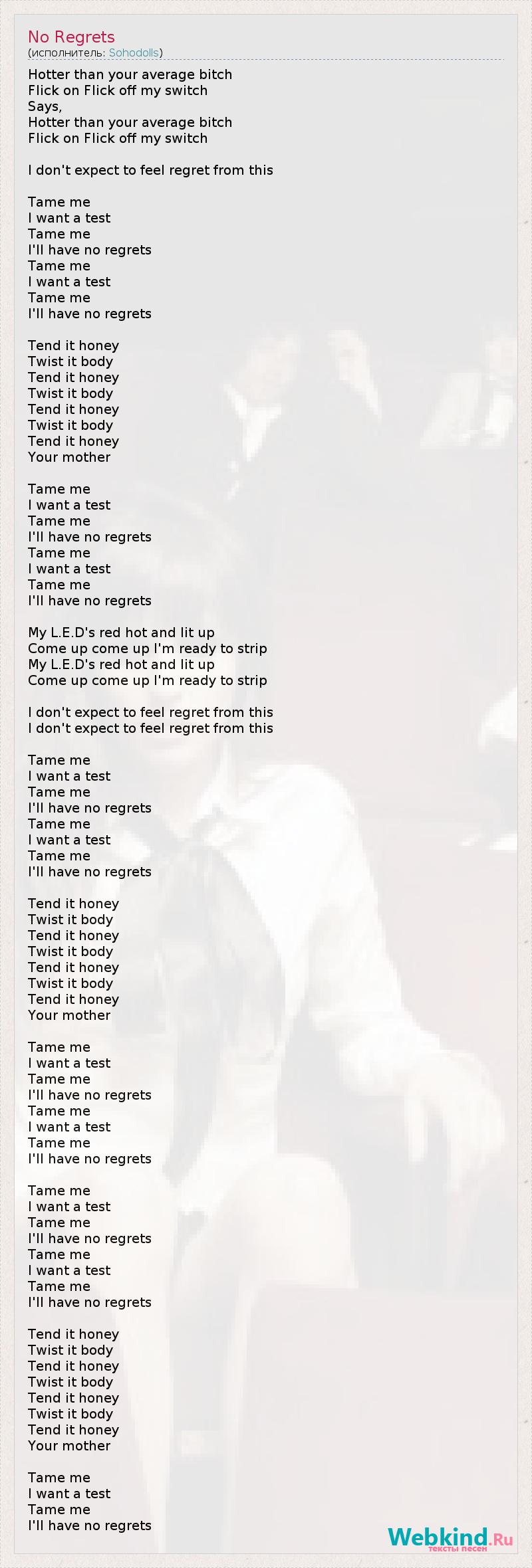 Hotter than your average bitch Flick on Flick off my switch Says, Hotter than your average bitch Flick on Flick off my switch I don't expect to feel regret from this Tame me I want a test Tame me I'll have no regrets Tame me I want a test Tame me I'll have no regrets Tend it honey Twist it body Tend it honey Twist it body Tend it honey Twist it body Tend it honey Your mother Tame me I want a test Tame me I'll have no regrets Tame me I want a test Tame me I'll have no regrets My L.E.D's red hot and lit up Come up come up I'm ready to strip My L.E.D's red hot and lit up Come up come up I'm ready to strip I don't expect to feel regret from this I don't expect to feel regret from this Tame me I want a test Tame me I'll have no regrets Tame me I want a test Tame me I'll have no regrets Tend it honey Twist it body Tend it honey Twist it body Tend it honey Twist it body Tend it honey Your mother Tame me I want a test Tame me I'll have no regrets Tame me I want a test Tame me I'll have no regrets Tame me I want a test Tame me I'll have no regrets Tame me I want a test Tame me I'll have no regrets Tend it honey Twist it body Tend it honey Twist it body Tend it honey Twist it body Tend it honey Your mother Tame me I want a test Tame me I'll have no regrets